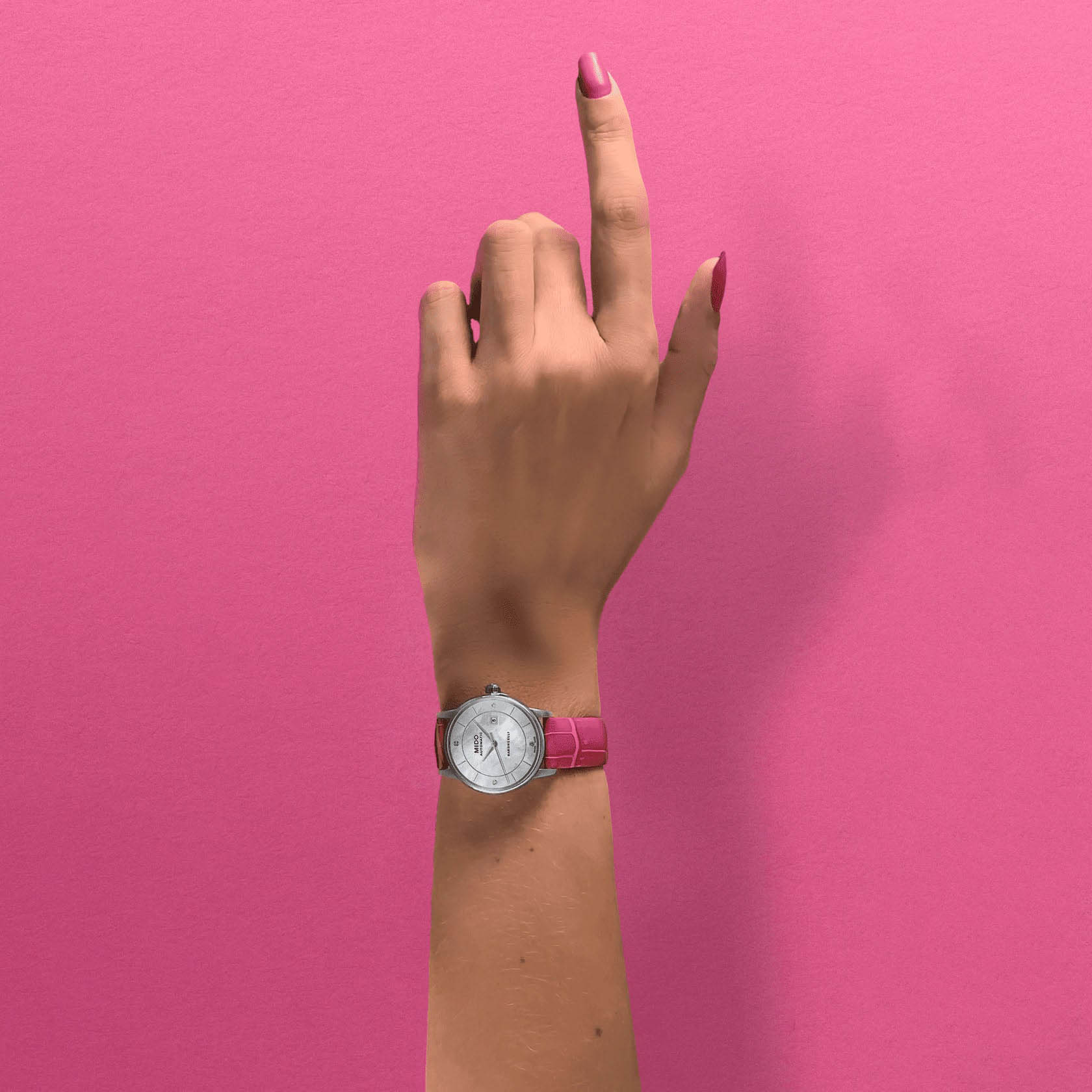 Специальное издание Baroncelli Signature Lady Colours представляет палитру красочных и женственных нот. Полностью меняет свой внешний вид, благодаря пяти разным кожаным ремешкам, легко взаимозаменяемым – «в один клик»! Четыре бриллианта сверкают на его радужном перламутровом циферблате. Его механическое сердце бьется в меру самых больших желаний благодаря отличной точности и безупречной надежности, поддерживаемой пружиной Nivachron™Nivachron™Специально разработанный инновационный сплав Nivachron™ повышает устойчивость часов к воздействию магнитных полей..