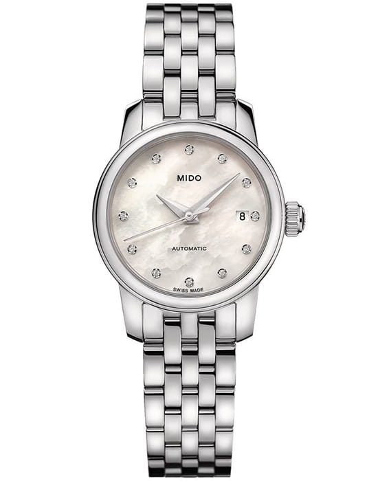 Mido Baroncelli Lady Twenty Five M039.007.11.106.00 — утончённые женские часы, созданные для тех, кто ценит изящество и швейцарскую точность. Корпус диаметром 25 мм выполнен из полированной нержавеющей стали и гармонично сочетается с пятизвенным браслетом, дополненным раскладной застёжкойРаскладная застёжкаТакой тип застёжки используется только на браслетах из металла. Она никогда не раскрывается полностью, происходит разделение на 2 и более частей. Раскладывающая застёжка снизит вероятность потери часов к минимуму.. Циферблат из натурального перламутра украшен двенадцатью бриллиантами-часовыми метками, создающими игру света и подчеркивающими утончённый характер модели. Защиту обеспечивает сапфировое стеклоСапфировое стеклоПрочный и надёжный материал из кристалла сапфира синтетического происхождения, характеризующийся особой твёрдостью и устойчивостью к царапинам и повреждениям. с надёжным антибликовым покрытиемАнтибликовое покрытиеСлой оксида металла в 0,13-0,3 микрон, благодаря которому стекло часов не бликует и не отражает свет. Антибликовое покрытие уменьшает отражение света в 10 раз, обеспечивая отличную читаемость показателей циферблата., что гарантирует отличную читаемость в любых условиях. Прозрачная задняя крышка открывает вид на тщательно декорированный ротор, что придаёт часам дополнительное очарование. Водозащита до 50 метров делает модель практичной для повседневного ношения, сохраняя при этом её ювелирную элегантность.