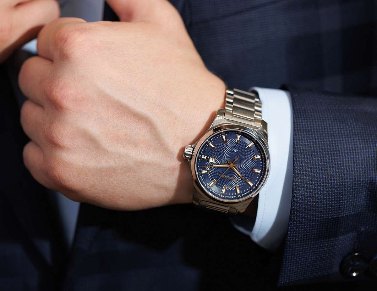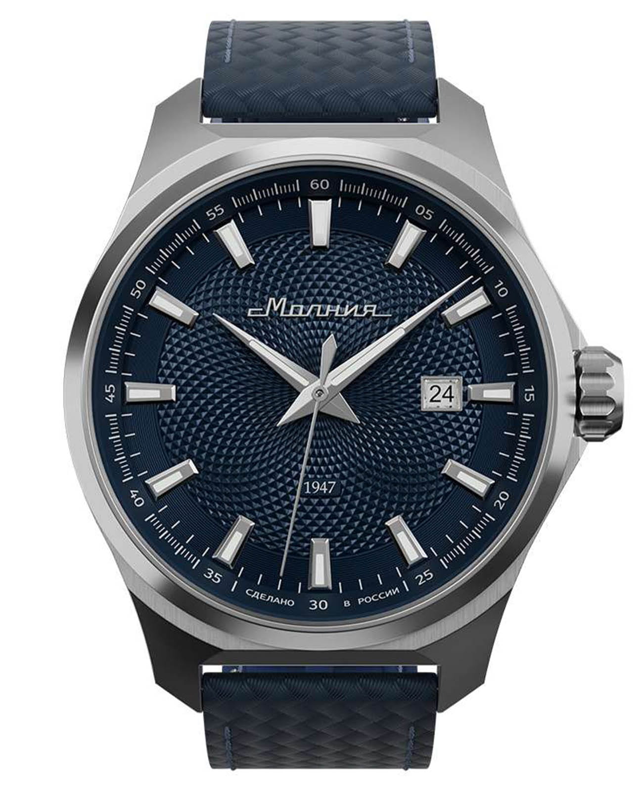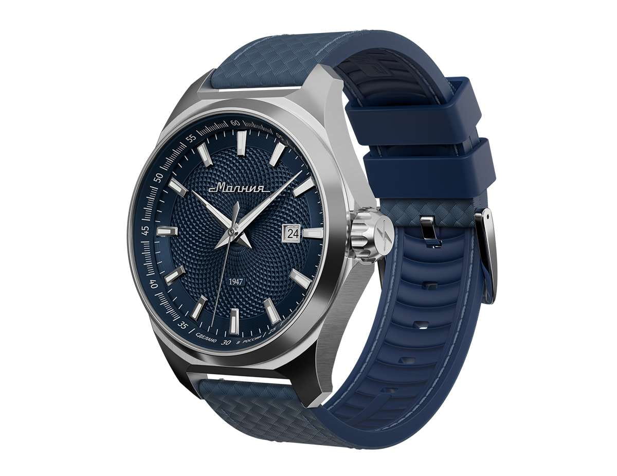 Мужские механические часы с автоподзаводом — это надёжный аксессуар от легендарного бренда «МОЛНИЯ», созданный на Челябинском часовом заводе. Корпус диаметром 42 мм выполнен из нержавеющей стали 316L с зеркальной полировкой. БезельБезельВнешний ободок, закрепляющий стекло. В спортивных часах так называется поворотное кольцо с делениями на циферблате, выполняет роль таймера – замеряет отрезки времени на шкале. Неподвижный безель – элемент декора. Однонаправленно вращающийся безель на дайверских часах позволяет фиксировать моменты погружения и выныривания на поверхность. также выполнен из стали с зеркальной отделкой. Циферблат синего цвета оформлен индексами и стрелками. Окошко даты расположено в положении 3 часов. Стрелки и метки с люминесцентным покрытиемЛюминесцентное покрытиеПозволяет считывать показания времени в темноте. Производители наносят на стрелки, часовые индексы, безель или поверхность циферблата светонакопительный состав, дающий холодное свечение. Super-LumiNova, обеспечивающим хорошую читаемость в темноте. Циферблат защищён сапфировым стекломСапфировое стеклоПрочный и надёжный материал из кристалла сапфира синтетического происхождения, характеризующийся особой твёрдостью и устойчивостью к царапинам и повреждениям. с антибликовым покрытиемАнтибликовое покрытиеСлой оксида металла в 0,13-0,3 микрон, благодаря которому стекло часов не бликует и не отражает свет. Антибликовое покрытие уменьшает отражение света в 10 раз, обеспечивая отличную читаемость показателей циферблата.. Механизм — японский автоматический калибр Miyota 8215 с функцией и запасом хода до 42 часов. Прозрачная задняя крышка позволяет наблюдать за работой механизма с кастомным ротором. Часы оснащены кожаным ремешком синего цвета с подкладкой из фтористого каучука и классической пряжкой, а также системой быстрой замены. Водонепроницаемость 100 м позволяет использовать часы для плавания и повседневного ношения. Идеальный выбор для тех, кто ценит качество, точность и стиль.