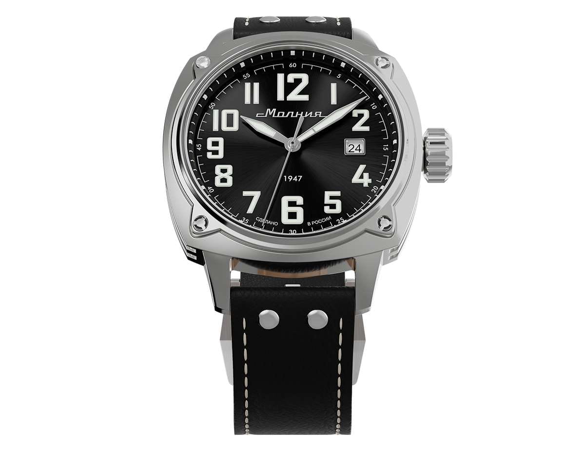 Мужские механические часы с автоподзаводом — это надёжный аксессуар от легендарного бренда «МОЛНИЯ», созданный на Челябинском часовом заводе. Корпус диаметром 42 мм выполнен из нержавеющей стали 316L с зеркальной полировкой. БезельБезельВнешний ободок, закрепляющий стекло. В спортивных часах так называется поворотное кольцо с делениями на циферблате, выполняет роль таймера – замеряет отрезки времени на шкале. Неподвижный безель – элемент декора. Однонаправленно вращающийся безель на дайверских часах позволяет фиксировать моменты погружения и выныривания на поверхность. также выполнен из стали с зеркальной отделкой. Циферблат чёрного цвета оформлен индексами и стрелками. Окошко даты расположено в положении 3 часов. Стрелки и метки с люминесцентным покрытиемЛюминесцентное покрытиеПозволяет считывать показания времени в темноте. Производители наносят на стрелки, часовые индексы, безель или поверхность циферблата светонакопительный состав, дающий холодное свечение. Super-LumiNova, обеспечивающим хорошую читаемость в темноте. Циферблат защищён сапфировым стекломСапфировое стеклоПрочный и надёжный материал из кристалла сапфира синтетического происхождения, характеризующийся особой твёрдостью и устойчивостью к царапинам и повреждениям. с антибликовым покрытиемАнтибликовое покрытиеСлой оксида металла в 0,13-0,3 микрон, благодаря которому стекло часов не бликует и не отражает свет. Антибликовое покрытие уменьшает отражение света в 10 раз, обеспечивая отличную читаемость показателей циферблата.. Механизм — японский автоматический калибр Miyota 8215 с функцией и запасом хода до 42 часов. Прозрачная задняя крышка позволяет наблюдать за работой механизма. Часы оснащены кожаным ремешком чёрного цвета с белой отстрочкой и классической пряжкой. Водонепроницаемость 100 м позволяет использовать часы для плавания и повседневного ношения. Идеальный выбор для тех, кто ценит качество, точность и стиль.