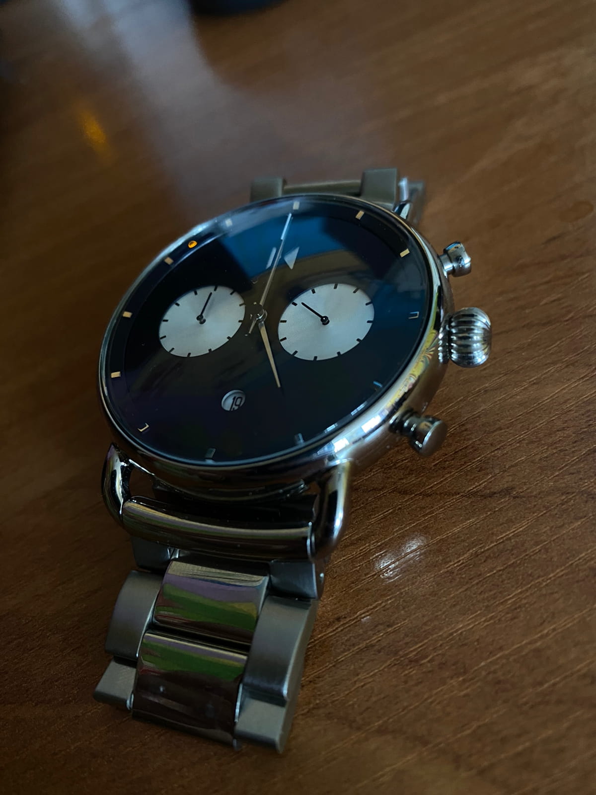 Мужские кварцевые часы-хронографХронографФункция позволяет измерять отрезки времени с особой точностью: часы, минуты, секунды. Верным признаком хронографа является наличие на циферблате 3 дополнительных окошек-счётчиков. с секундомеромСекундомерСекундоме́р — прибор, способный измерять интервалы времени с точностью до долей секунды. MVMT D-BT01-BLUS – лаконичная красота и изысканная элегантность. Оригинальная модель с классическим оформлением станет превосходным завершением образа, наделив его индивидуальным характером. Корпус выполнен из нержавеющей стали серебристого цвета, диаметром 47 мм и толщиной 13,5 мм, что обеспечивает долговечность и надежность. Закаленное минеральное стеклоМинеральное стеклоМинеральное стекло представляет собой искусственно выращенный минерал кварца. Такое стекло отличается особой устойчивостью к повреждениям и царапинам. Уступает по некоторым качествам сапфировому стеклу. защищает циферблат от царапин. Стальной браслет на раскладной застёжке с фиксаторомРаскладная застёжкаТакой тип застёжки используется только на браслетах из металла. Она никогда не раскрывается полностью, происходит разделение на 2 и более частей. Раскладывающая застёжка снизит вероятность потери часов к минимуму. обеспечивает комфортное ношение. Водозащита 100 метров позволит плавать, нырять и заниматься другими водными видами спорта. Рифленая заводная головка с защитой. Это аксессуар для мужчины, который ценит классический стиль и функциональность.
