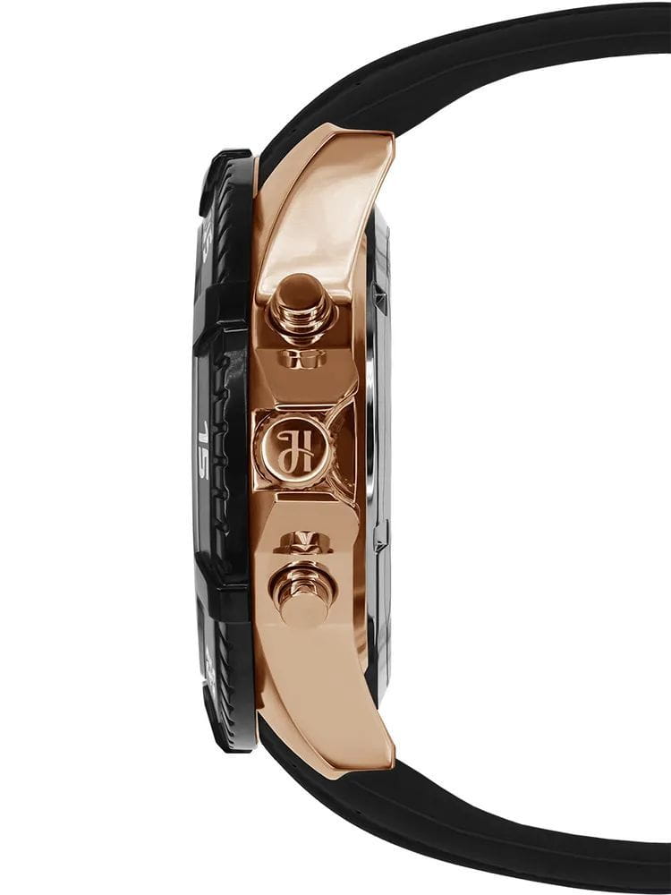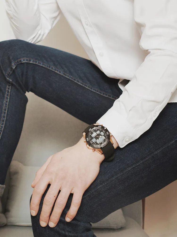 Ремешок выполнен из прочного силикона, обеспечивая комфорт при носке и добавляя модели спортивный характер. Толщина корпуса составляет 17 мм, что придаёт часам солидный вид.
