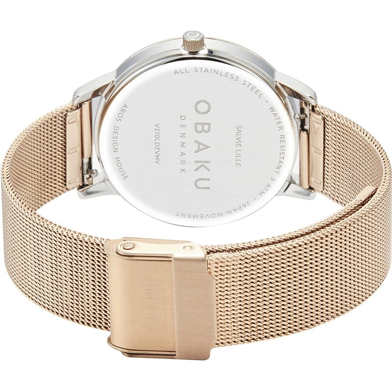 Женские кварцевые часы в классическом стиле Obaku Salvie V270LDZVMV, кварцевый механизм с высокой точностью. Класс водозащиты: 30 метров, позволит защитить корпус от случайных брызг или капель дождя. Корпус часов изготовлен из стали с частичным IP-покрытиемIP-покрытиеМетод ионного напыления. Демонстрирует повышенную устойчивость к истиранию, окислению и химическим веществам. Под воздействием высокого давления и температуры около 1500°C молекулы металла надёжно соединяются с частицами корпуса часов.. Апертура даты в позиции 6 часов. Золотисто-розовый циферблат. Стальной браслет с IP-покрытиемIP-покрытиеМетод ионного напыления. Демонстрирует повышенную устойчивость к истиранию, окислению и химическим веществам. Под воздействием высокого давления и температуры около 1500°C молекулы металла надёжно соединяются с частицами корпуса часов. выполнен в технике миланского плетения, раскладная застёжкаРаскладная застёжкаТакой тип застёжки используется только на браслетах из металла. Она никогда не раскрывается полностью, происходит разделение на 2 и более частей. Раскладывающая застёжка снизит вероятность потери часов к минимуму.. Прочное минеральное стеклоМинеральное стеклоМинеральное стекло представляет собой искусственно выращенный минерал кварца. Такое стекло отличается особой устойчивостью к повреждениям и царапинам. Уступает по некоторым качествам сапфировому стеклу. устойчивое к мелким механическим повреждениям.