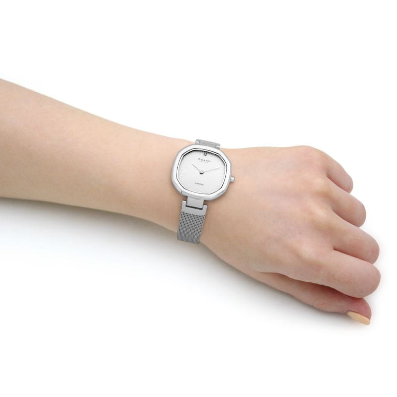 Женские наручные кварцевые часы с минеральным стекломМинеральное стеклоМинеральное стекло представляет собой искусственно выращенный минерал кварца. Такое стекло отличается особой устойчивостью к повреждениям и царапинам. Уступает по некоторым качествам сапфировому стеклу. Obaku Diamond V277LXCIMC, кварцевый механизм с высокой точностью. Класс водозащиты: 30 метров, позволит защитить корпус от случайных брызг или капель дождя. Корпус часов изготовлен из стали. Стальной браслет выполнен в технике миланского плетения на раскладной застёжкеРаскладная застёжкаТакой тип застёжки используется только на браслетах из металла. Она никогда не раскрывается полностью, происходит разделение на 2 и более частей. Раскладывающая застёжка снизит вероятность потери часов к минимуму.. Серебристый циферблат декорирован бриллиантом.