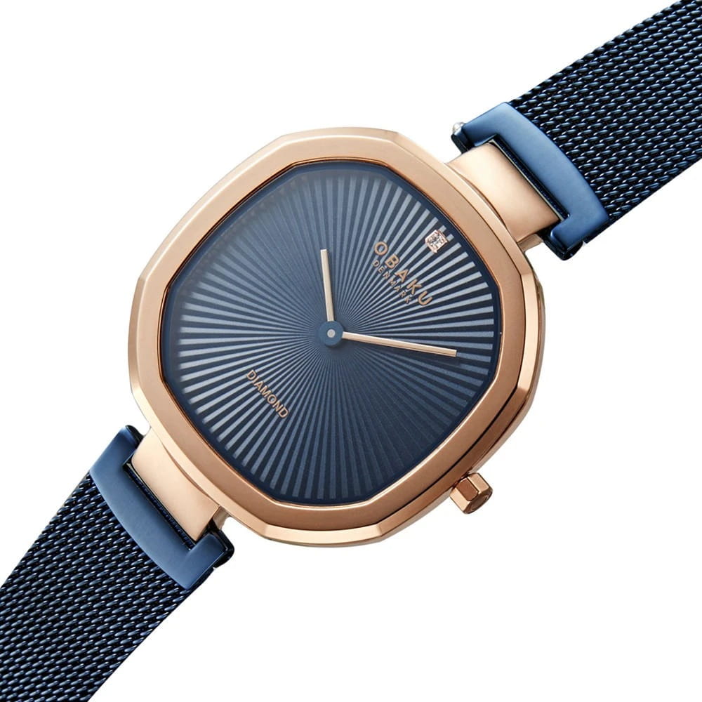 Женские наручные кварцевые часы с минеральным стекломМинеральное стеклоМинеральное стекло представляет собой искусственно выращенный минерал кварца. Такое стекло отличается особой устойчивостью к повреждениям и царапинам. Уступает по некоторым качествам сапфировому стеклу. Obaku Diamond V277LXVLML, кварцевый механизм с высокой точностью. Класс водозащиты: 30 метров, позволит защитить корпус от случайных брызг или капель дождя. Корпус часов изготовлен из стали с IP-покрытиемIP-покрытиеМетод ионного напыления. Демонстрирует повышенную устойчивость к истиранию, окислению и химическим веществам. Под воздействием высокого давления и температуры около 1500°C молекулы металла надёжно соединяются с частицами корпуса часов.. Стальной браслет выполнен в технике миланского плетения с IP-покрытиемIP-покрытиеМетод ионного напыления. Демонстрирует повышенную устойчивость к истиранию, окислению и химическим веществам. Под воздействием высокого давления и температуры около 1500°C молекулы металла надёжно соединяются с частицами корпуса часов. на раскладной застёжкеРаскладная застёжкаТакой тип застёжки используется только на браслетах из металла. Она никогда не раскрывается полностью, происходит разделение на 2 и более частей. Раскладывающая застёжка снизит вероятность потери часов к минимуму.. Синий циферблат декорирован бриллиантом.