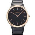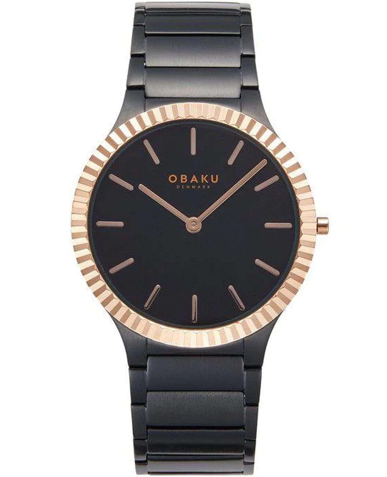 Мужские наручные часы Obaku V292GXMBSB сочетают в себе стильный дизайн и практичность. Модель обладает круглым корпусом диаметром 40 мм, выполненным из нержавеющей стали с IP-покрытиемIP-покрытиеМетод ионного напыления. Демонстрирует повышенную устойчивость к истиранию, окислению и химическим веществам. Под воздействием высокого давления и температуры около 1500°C молекулы металла надёжно соединяются с частицами корпуса часов. черного цвета. БезельБезельВнешний ободок, закрепляющий стекло. В спортивных часах так называется поворотное кольцо с делениями на циферблате, выполняет роль таймера – замеряет отрезки времени на шкале. Неподвижный безель – элемент декора. Однонаправленно вращающийся безель на дайверских часах позволяет фиксировать моменты погружения и выныривания на поверхность. с IP-покрытиемIP-покрытиеМетод ионного напыления. Демонстрирует повышенную устойчивость к истиранию, окислению и химическим веществам. Под воздействием высокого давления и температуры около 1500°C молекулы металла надёжно соединяются с частицами корпуса часов. в оттенке розового золота . Браслет также изготовлен из нержавеющей стали с IP-покрытиемIP-покрытиеМетод ионного напыления. Демонстрирует повышенную устойчивость к истиранию, окислению и химическим веществам. Под воздействием высокого давления и температуры около 1500°C молекулы металла надёжно соединяются с частицами корпуса часов. черного цвета, что обеспечивает элегантный внешний вид и комфорт при ношении. Черный циферблат защищен минеральным стекломМинеральное стеклоМинеральное стекло представляет собой искусственно выращенный минерал кварца. Такое стекло отличается особой устойчивостью к повреждениям и царапинам. Уступает по некоторым качествам сапфировому стеклу., которое устойчиво к царапинам и гарантирует длительное сохранение прозрачности . Часы оснащены кварцевым механизмом, обеспечивающим высокую точность хода. Водонепроницаемость модели составляет 3 атмосферы, что позволяет использовать их в повседневной жизни, включая контакт с водой при мытье рук .