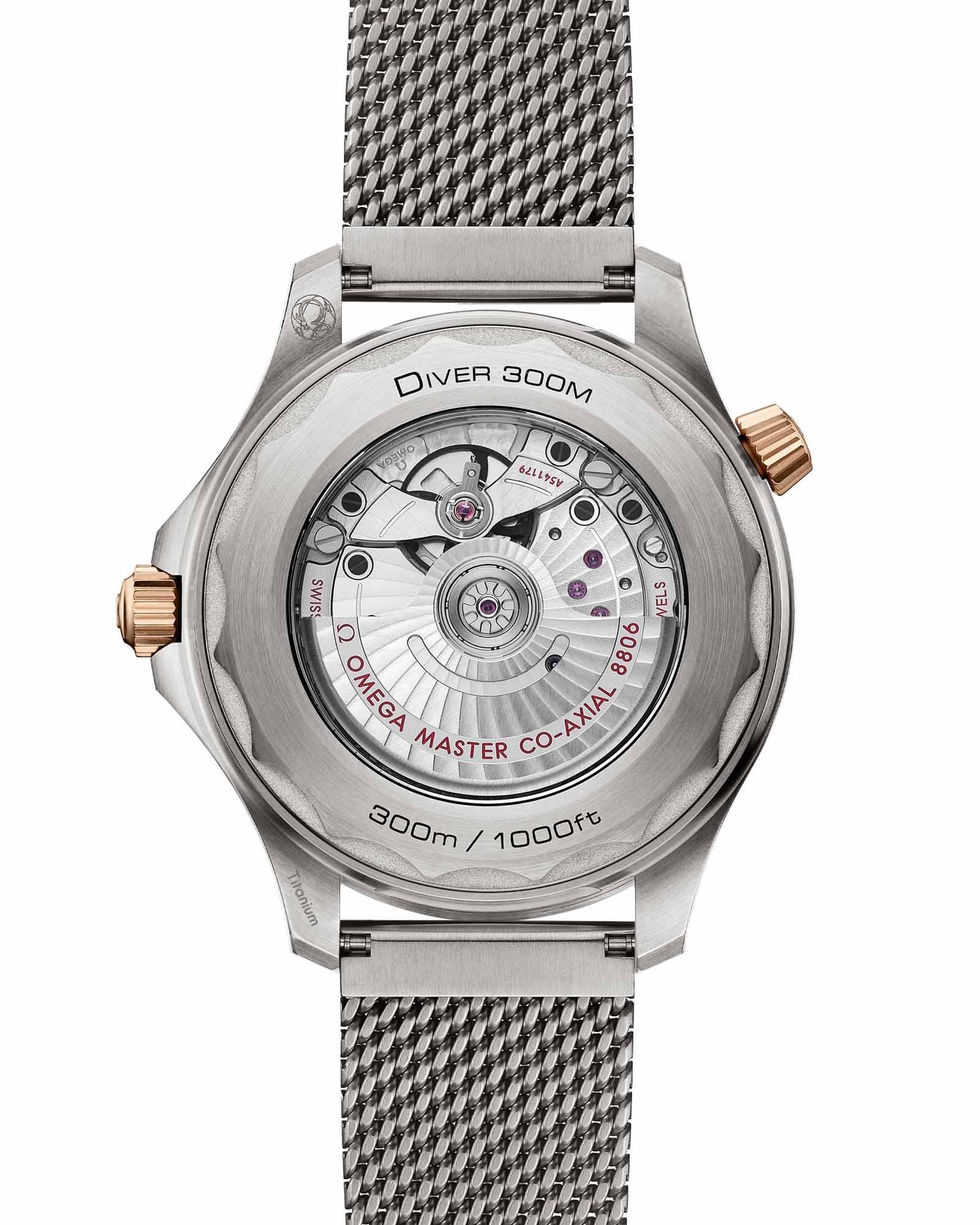 с PVD-покрытиемPVDУльтратонкое покрытие наносится в технике вакуумного напыления, сочетает в себе нитрид титана особой прочности со слоем золота или оксида хрома. Несёт в себе декоративную или защитную функцию. и черненые индексы заполнены винтажным люминесцентным составомЛюминесцентное покрытиеПозволяет считывать показания времени в темноте. Производители наносят на стрелки, часовые индексы, безель или поверхность циферблата светонакопительный состав, дающий холодное свечение. Super-LumiNova. Остальные метки, в том числе логотип OMEGA, выполнены в светло-коричневом и красном цветах переводным способом."Часы"} дополнены матовым браслетом сетчатого плетения с застежкой и оснащены калибром OMEGA Co-Axial Master Chronometer 8806, который можно рассмотреть сквозь заднюю крышку из сапфирового стеклаСапфировое стеклоПрочный и надёжный материал из кристалла сапфира синтетического происхождения, характеризующийся особой твёрдостью и устойчивостью к царапинам и повреждениям. с волнистым краем.