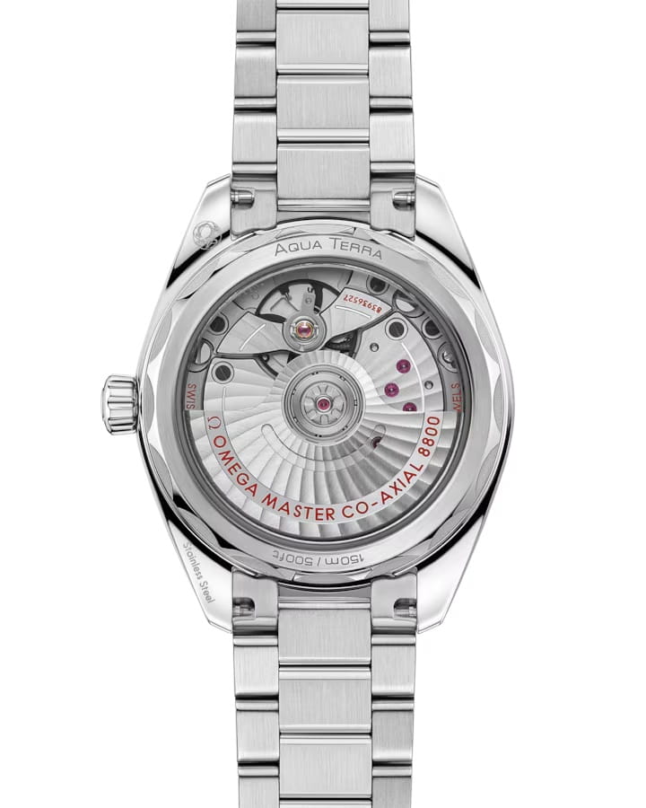 Omega Seamaster Aqua Terra выполнены в симметричном корпусе из полированной нержавеющей стали с завинчивающейся задней крышкой, украшенной волновым узором. Циферблат морского оттенка изготовлен из латуни и обработан методом солнечной шлифовки от центра к краям. Циферблат дополнен окошком даты на 6 часах, стрелками и метками из 18K белого золота с алмазной полировкой для высокой контрастности и читаемости. Логотип OMEGA также выполнен из белого золота. Калибр Omega 8800 сертифицирован как Master Chronometer — гарантия высочайшей точности и устойчивости к магнитным полям. Запас хода составляет 55 часов. Защиту циферблата обеспечивает сапфировое стеклоСапфировое стеклоПрочный и надёжный материал из кристалла сапфира синтетического происхождения, характеризующийся особой твёрдостью и устойчивостью к царапинам и повреждениям. с антибликовым покрытиемАнтибликовое покрытиеСлой оксида металла в 0,13-0,3 микрон, благодаря которому стекло часов не бликует и не отражает свет. Антибликовое покрытие уменьшает отражение света в 10 раз, обеспечивая отличную читаемость показателей циферблата. с обеих сторон. Водозащита позволяет использовать часы в воде без риска повреждения. Часы установлены на браслет со скруглёнными звеньями и раскладной застёжкойРаскладная застёжкаТакой тип застёжки используется только на браслетах из металла. Она никогда не раскрывается полностью, происходит разделение на 2 и более частей. Раскладывающая застёжка снизит вероятность потери часов к минимуму.. Это сочетание премиального качества, технологичности и классического дизайна.