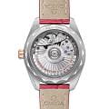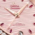 Женские часы Omega Seamaster Aqua Terra выполнены в симметричном корпусе из нержавеющей стали и 18K Sedna™ золота с завинчивающейся задней крышкой, украшенной волновым узором. Безель полированный и инкрустирован бриллиантами, что подчеркивает их роскошный дизайн. Циферблат нежно-розового цвета имеет текстуру в виде волн, окошко даты на 6 часах и 11 часовых меток в виде рубинов маркизной огранки. Стрелки выполнены из 18K Sedna™ золота с алмазной полировкой и оснащены люминесцентным покрытиемЛюминесцентное покрытиеПозволяет считывать показания времени в темноте. Производители наносят на стрелки, часовые индексы, безель или поверхность циферблата светонакопительный состав, дающий холодное свечение. для лучшей читаемости в темноте. Калибр Omega 8800 сертифицирован как Master Chronometer — гарантия высочайшей точности и устойчивости к магнитным полям. Запас хода составляет 55 часов. Защиту циферблата обеспечивает сапфировое стеклоСапфировое стеклоПрочный и надёжный материал из кристалла сапфира синтетического происхождения, характеризующийся особой твёрдостью и устойчивостью к царапинам и повреждениям. с антибликовым покрытиемАнтибликовое покрытиеСлой оксида металла в 0,13-0,3 микрон, благодаря которому стекло часов не бликует и не отражает свет. Антибликовое покрытие уменьшает отражение света в 10 раз, обеспечивая отличную читаемость показателей циферблата. с обеих сторон. Водозащита позволяет использовать часы в воде без риска повреждения. Часы установлены на кожаный ремешок красного цвета. Вес модели — около 65 грамм. Это сочетание премиального качества, технологичности и классического дизайна.