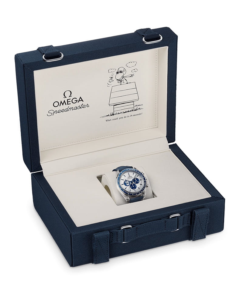 Эти уникальные часы созданы в честь 50-летия награды "Серебряный Снупи", врученной OMEGA астронавтами NASA в 1970 году за вклад в миссию "Аполлон-13". Модель в 42-мм корпусе из нержавеющей стали представлена на нейлоновом ремешкеРемешок NATOРемешок NATO — это прочный, универсальный и сменный часовой ремешок, изначально созданный для военных. Он изготовлен из нейлона или другого прочного материала и имеет уникальную конструкцию, которая позволяет часам оставаться на запястье даже в случае поломки одной из прикрепляющих точек. синего цвета с тиснением траектории полета "Аполлон-13". Серебряный циферблат украшен стрелками и индексами с PVD-покрытиемPVDУльтратонкое покрытие наносится в технике вакуумного напыления, сочетает в себе нитрид титана особой прочности со слоем золота или оксида хрома. Несёт в себе декоративную или защитную функцию. синего цвета, а на позиции "9 часов" расположен медальон с Снупи. БезельБезельВнешний ободок, закрепляющий стекло. В спортивных часах так называется поворотное кольцо с делениями на циферблате, выполняет роль таймера – замеряет отрезки времени на шкале. Неподвижный безель – элемент декора. Однонаправленно вращающийся безель на дайверских часах позволяет фиксировать моменты погружения и выныривания на поверхность. из черной керамики [ZrO2] с тахиметрической шкалойТахиметрРазмеченная шкала, располагается на ободке или безеле часов. Тахиметр позволяет рассчитать скорость на определённом участке пути, расстояние измеряется в километрах или милях. в белой эмали обрамляет циферблат. Задняя крышка с сапфировым стекломСапфировое стеклоПрочный и надёжный материал из кристалла сапфира синтетического происхождения, характеризующийся особой твёрдостью и устойчивостью к царапинам и повреждениям. и системой NAIAD LOCK демонстрирует изображение обратной стороны Луны. Особенность модели - анимация: при активации хронографаХронографФункция позволяет измерять отрезки времени с особой точностью: часы, минуты, секунды. Верным признаком хронографа является наличие на циферблате 3 дополнительных окошек-счётчиков. Снупи в модуле совершает оборот вокруг Земли, которая вращается синхронно с секундной стрелкой. Часы с механизмом OMEGA Co-Axial Master Chronometer 3861 дополнены гравировками, посвященными миссии "Аполлон-13" и награде "Серебряный Снупи". Комплектация включает специальный подарочный футляр, подчеркивающий исключительность этой модели.