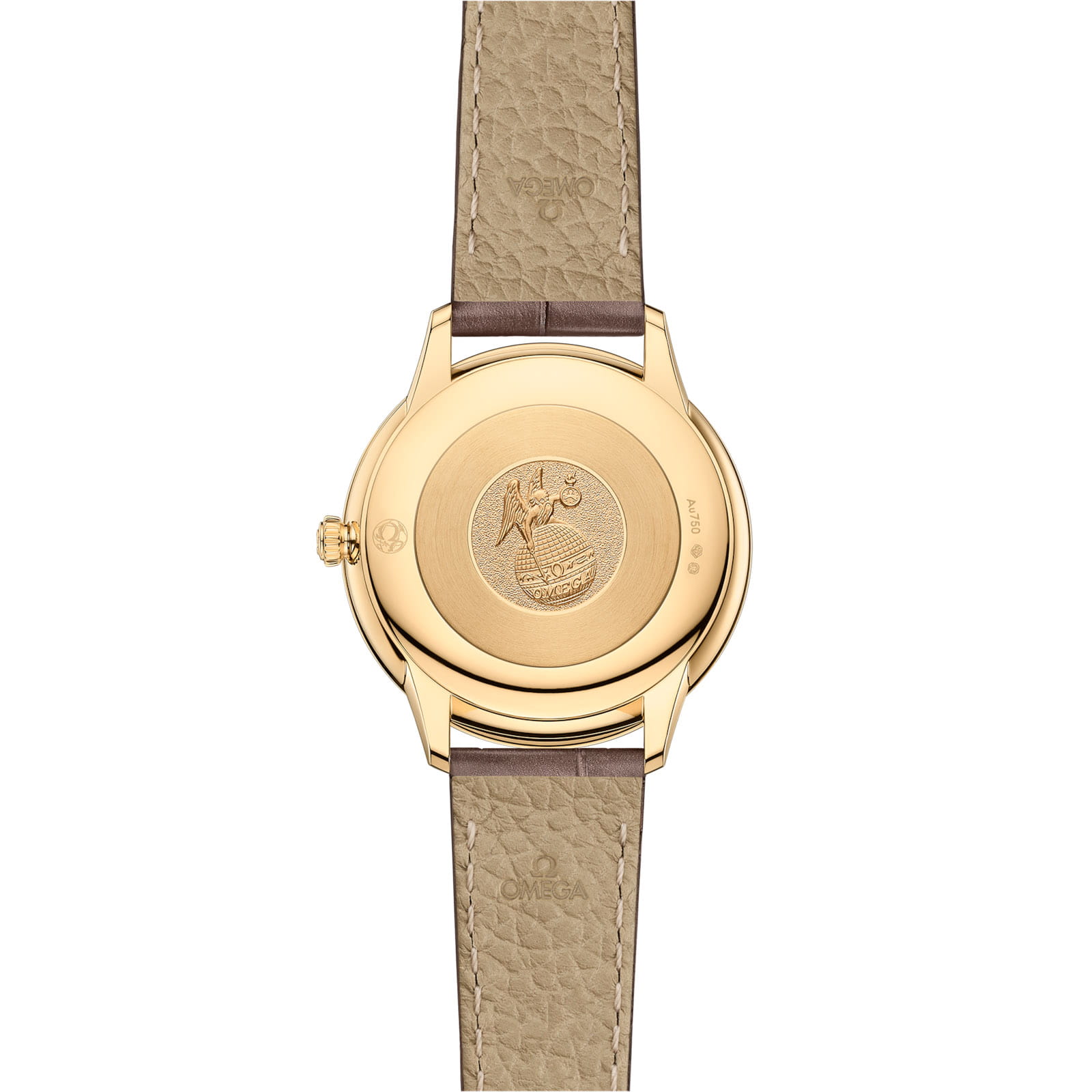 грациозно соседствуют с чередующимися римскими цифрами и бриллиантовыми метками. Лаконичный дизайн дополнен изящной минутной шкалой в виде точечных маркеров и задней крышкой с рельефным медальоном, изображающим бога времени Хроноса. Часы представлены с переливающимся кожаным ремешком серо-коричневого оттенка и оснащены кварцевым механизмом OMEGA 4061, гарантирующим точность хода на протяжении не менее 48 месяцев.