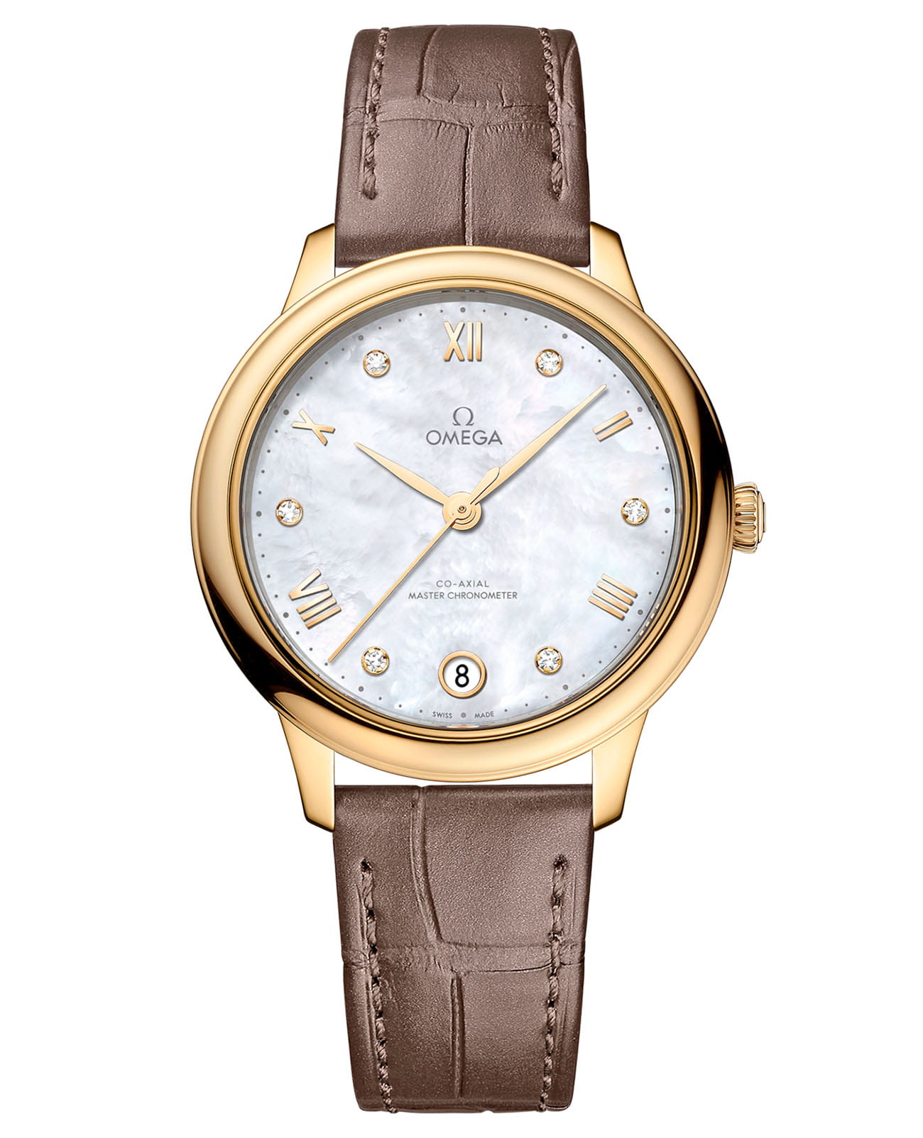 танцуют между чередующимися римскими цифрами и бриллиантовыми метками. Лаконичный дизайн дополнен практичной элегантностью: окошком даты на позиции «6 часов» и утонченной минутной шкалой в виде россыпи точек по периметру. Обладая престижным сертификатом Master Chronometer, модель представлена с переливающимся кожаным ремешком серо-коричневых тонов, а ее механическое сердце - калибр OMEGA Master Co-Axial 8800 - демонстрируется через прочное сапфировое стеклоСапфировое стеклоПрочный и надёжный материал из кристалла сапфира синтетического происхождения, характеризующийся особой твёрдостью и устойчивостью к царапинам и повреждениям. задней крышки, открывая взору истинную поэзию часового мастерства.