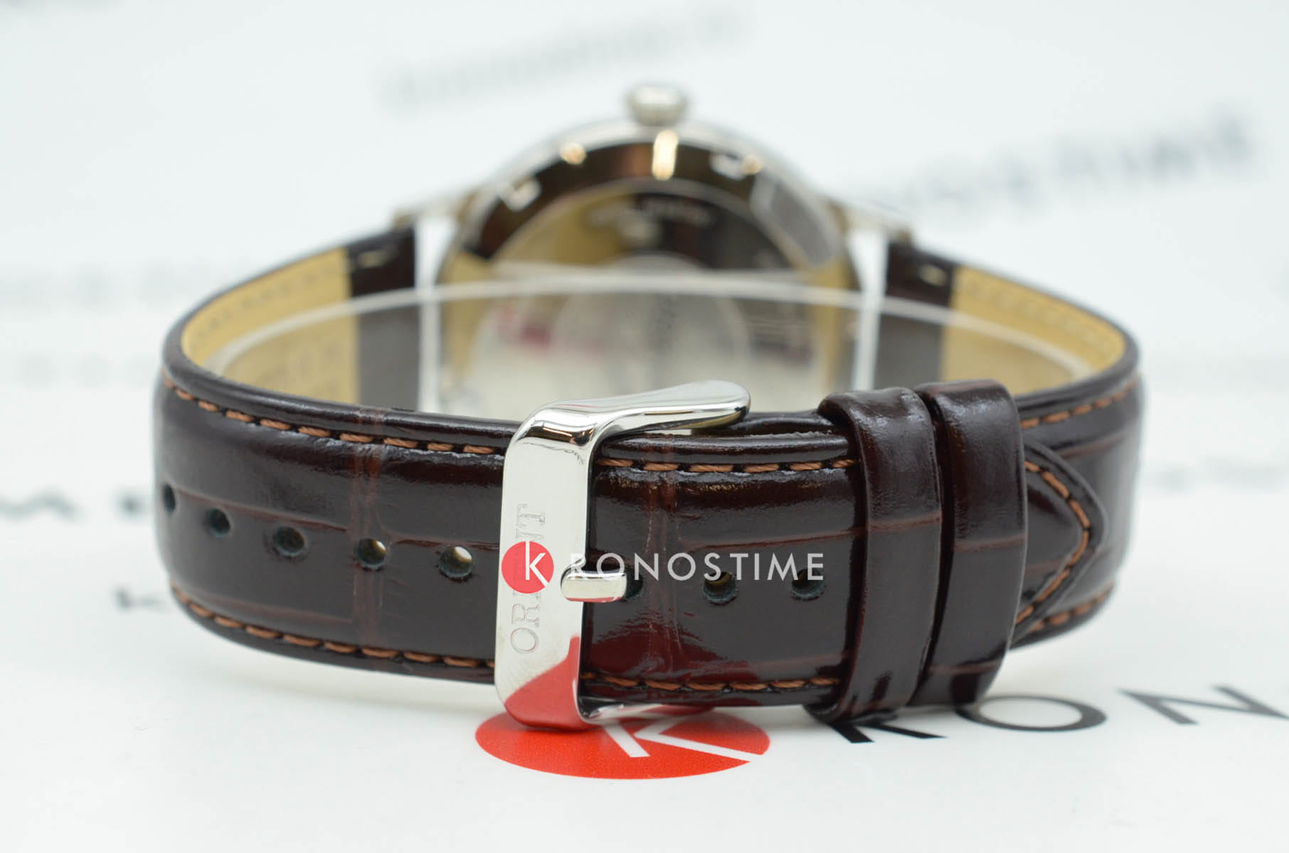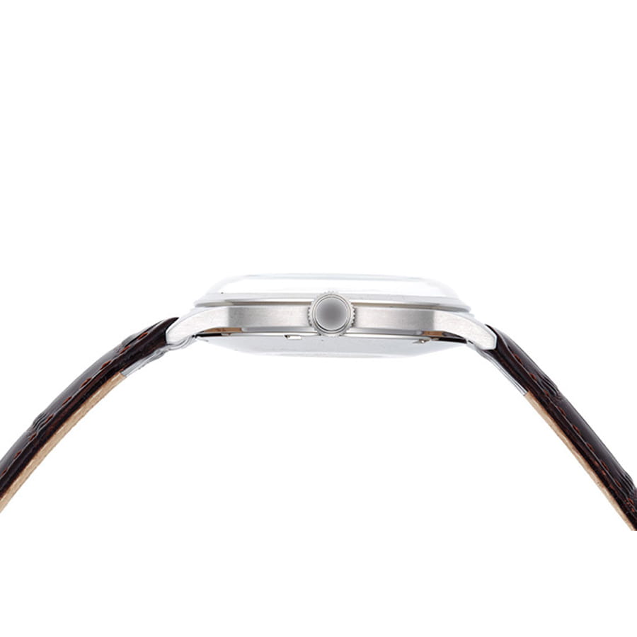 Ремешок выполнен из натуральной кожи с тиснением под крокодила и дополнен классической пряжкой. Его тёплый коричневый оттенок удачно сочетается с оттенком циферблата и добавляет образу завершённости. Водонепроницаемость — до 3 ATM, что подходит для защиты от случайных брызг и дождя.