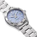 Циферблат выполнен в нежном небесно-голубом оттенке с эффектом солнечных лучей и оформлен винтажным логотипом Orient. Часовые метки и стрелки покрыты люминесцентным покрытиемЛюминесцентное покрытиеПозволяет считывать показания времени в темноте. Производители наносят на стрелки, часовые индексы, безель или поверхность циферблата светонакопительный состав, дающий холодное свечение., что обеспечивает отличную читаемость даже в условиях плохой освещённости. Односторонний вращающийся безельБезельВнешний ободок, закрепляющий стекло. В спортивных часах так называется поворотное кольцо с делениями на циферблате, выполняет роль таймера – замеряет отрезки времени на шкале. Неподвижный безель – элемент декора. Однонаправленно вращающийся безель на дайверских часах позволяет фиксировать моменты погружения и выныривания на поверхность. подчёркивает классическую дайверскую эстетику.