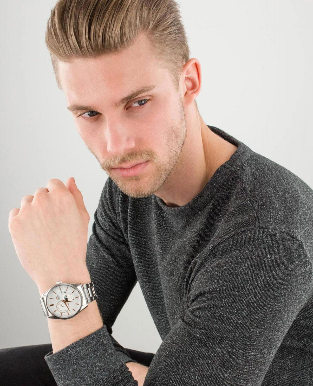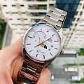 Часы Orient RA-AK0301S из коллекции Sun & Moon — это изысканный аксессуар, сочетающий элегантный дизайн и современные функции. Корпус диаметром 41,5 мм выполнен из нержавеющей стали и защищён сапфировым стекломСапфировое стеклоПрочный и надёжный материал из кристалла сапфира синтетического происхождения, характеризующийся особой твёрдостью и устойчивостью к царапинам и повреждениям., обеспечивающим стойкость к царапинам. Белый циферблат украшен , который показывает смену времени суток, а римские цифры и золотистые стрелки добавляют классической элегантности. Окошко даты расположено на отметке «3 часа», а дополнительный индикатор отображает день недели. Автоматический механизм Orient Calibre F6B24 с функцией ручного завода и остановки секундной стрелки обеспечивает точность и надёжность. Запас хода до 40 часов гарантирует бесперебойную работу часов. Браслет из нержавеющей стали с раскладной застёжкойРаскладная застёжкаТакой тип застёжки используется только на браслетах из металла. Она никогда не раскрывается полностью, происходит разделение на 2 и более частей. Раскладывающая застёжка снизит вероятность потери часов к минимуму. обеспечивает комфортное ношение и надёжную фиксацию. Водонепроницаемость до 50 метров защищает модель от случайных брызг. Orient RA-AK0301S — идеальные часы для тех, кто ценит японское качество, функциональность и классический стиль.