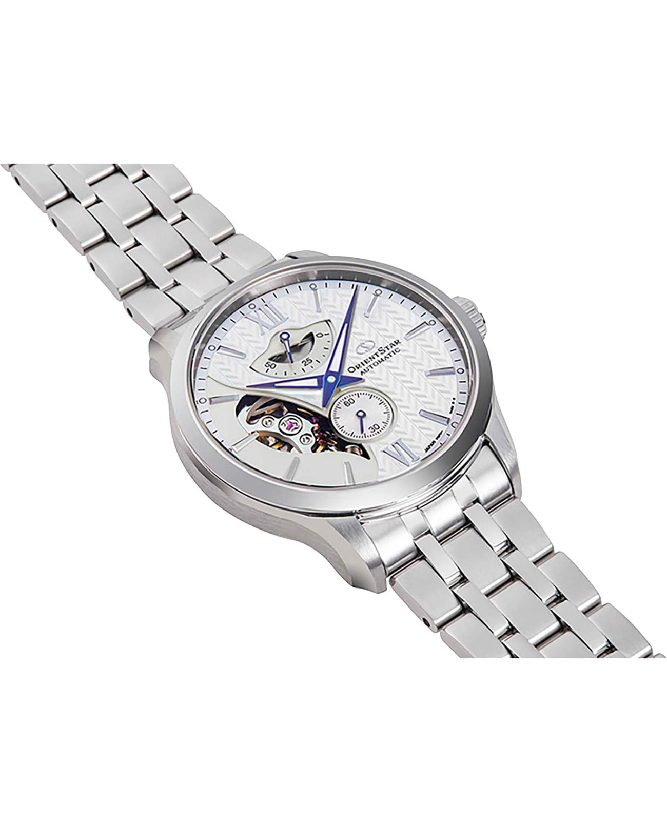 Часы Orient Star RK-AV0B01S — это мужская модель, которая сочетает в себе современный дизайн и передовые технологии. Корпус выполнен из нержавеющей стали, имеет круглую форму с диаметром 41 мм и толщиной 13,6 мм. Часы оснащены белым циферблатом с уникальным двухслойным дизайном, где верхний слой выполнен в виде узора «елочка», а нижний — с узором «пейсли», что создает эффект глубины и текстуры, напоминающей ткань костюма. Защита циферблата обеспечивается сапфировым стекломСапфировое стеклоПрочный и надёжный материал из кристалла сапфира синтетического происхождения, характеризующийся особой твёрдостью и устойчивостью к царапинам и повреждениям. с антибликовым покрытиемАнтибликовое покрытиеСлой оксида металла в 0,13-0,3 микрон, благодаря которому стекло часов не бликует и не отражает свет. Антибликовое покрытие уменьшает отражение света в 10 раз, обеспечивая отличную читаемость показателей циферблата., что повышает читаемость и устойчивость к царапинам.