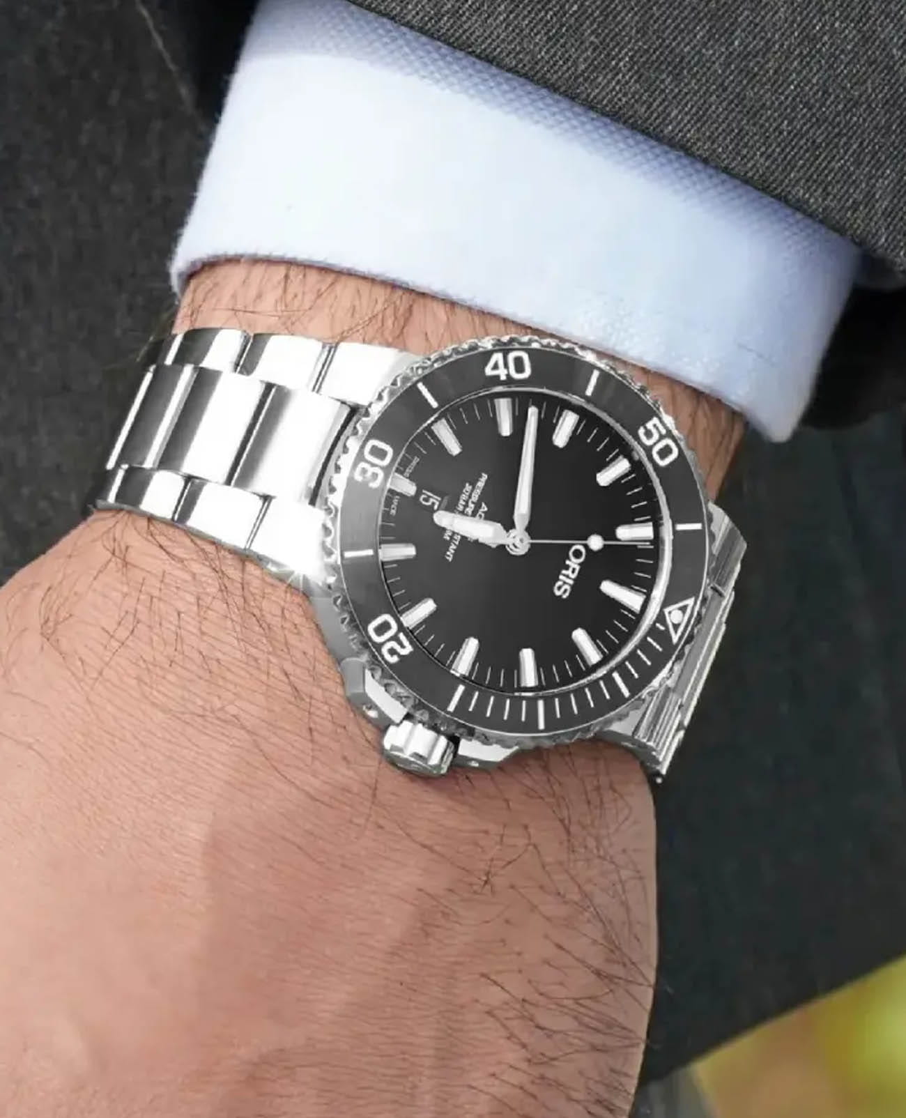 Корпус выполнен из прочной нержавеющей стали, что обеспечивает долговечность и устойчивость к внешним воздействиям. Поворотный безель помогает точно отслеживать время погружения, делая эти часы незаменимыми для дайверов. Циферблат черного цвета с метками в виде штрихов защищен сапфировым стекломСапфировое стеклоПрочный и надёжный материал из кристалла сапфира синтетического происхождения, характеризующийся особой твёрдостью и устойчивостью к царапинам и повреждениям., которое не царапается при механическом воздействии и является одним из лучших материалов для наручных часов.