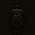 Многокомпонентный бронзовый корпус, бронзовый вращающийся безельБезельВнешний ободок, закрепляющий стекло. В спортивных часах так называется поворотное кольцо с делениями на циферблате, выполняет роль таймера – замеряет отрезки времени на шкале. Неподвижный безель – элемент декора. Однонаправленно вращающийся безель на дайверских часах позволяет фиксировать моменты погружения и выныривания на поверхность. с минутной шкалой. Сапфировое стеклоСапфировое стеклоПрочный и надёжный материал из кристалла сапфира синтетического происхождения, характеризующийся особой твёрдостью и устойчивостью к царапинам и повреждениям., выпуклое с обеих сторон, внутреннее антибликовое покрытие. Прозрачная задняя крышка из сапфирового стеклаСапфировое стеклоПрочный и надёжный материал из кристалла сапфира синтетического происхождения, характеризующийся особой твёрдостью и устойчивостью к царапинам и повреждениям.. Стрелки и метки с люминесцентным покрытиемЛюминесцентное покрытиеПозволяет считывать показания времени в темноте. Производители наносят на стрелки, часовые индексы, безель или поверхность циферблата светонакопительный состав, дающий холодное свечение.. Завинчивающаяся заводная головка.