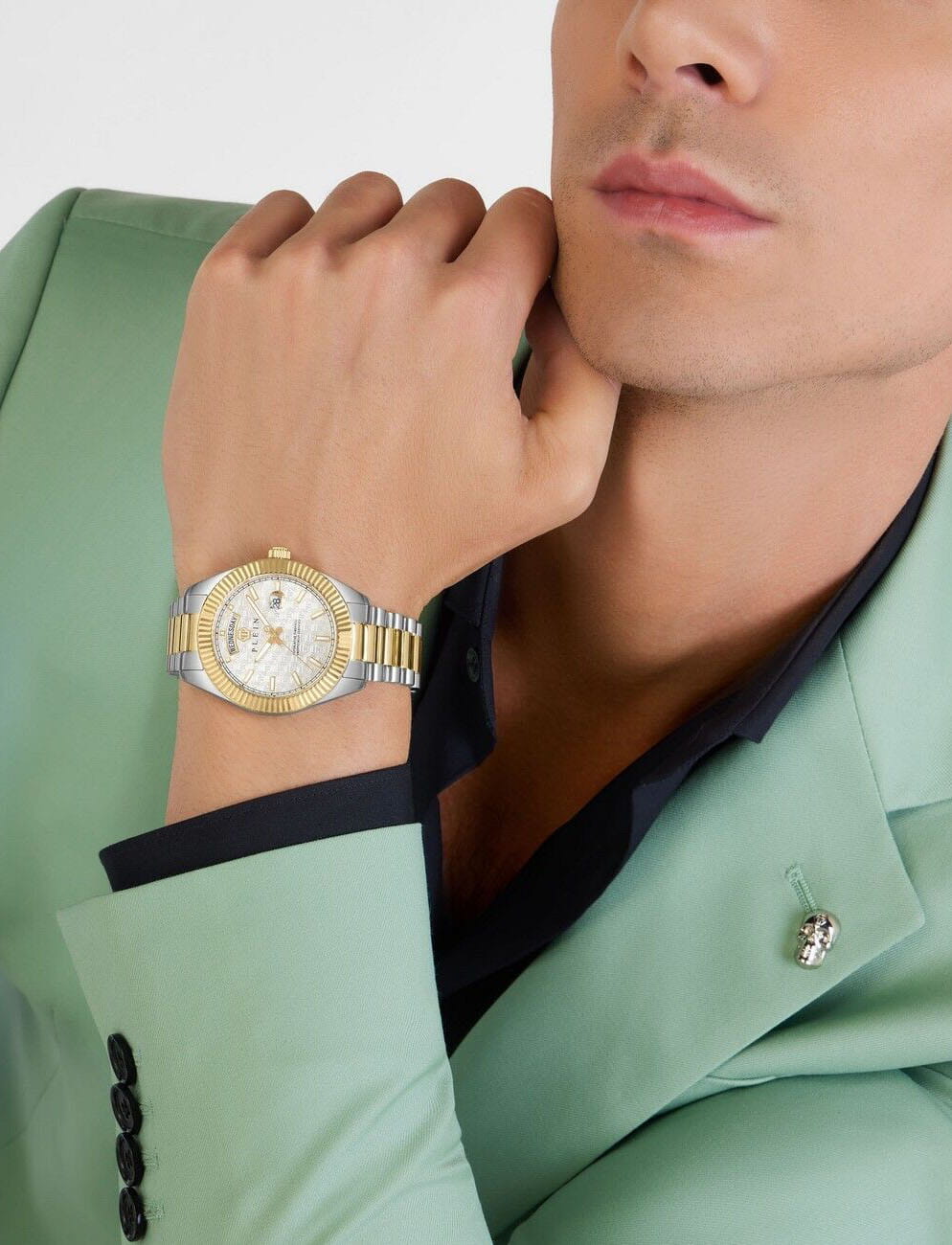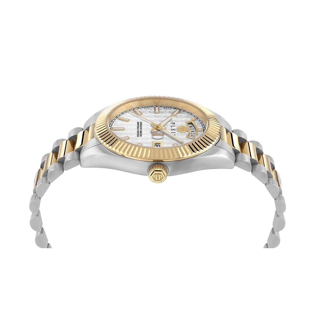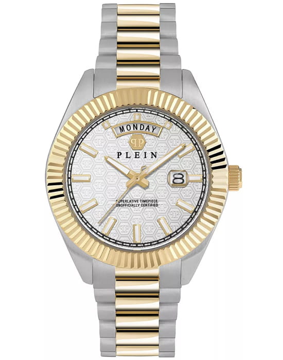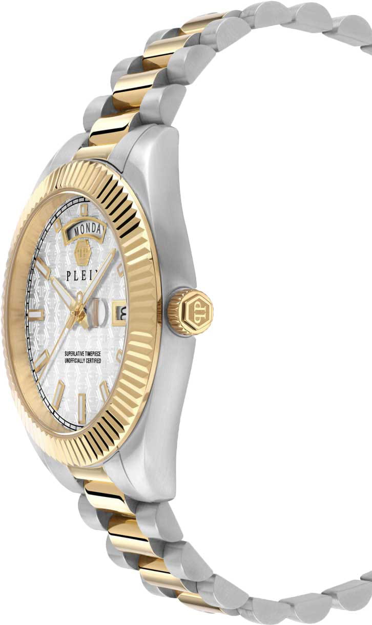 Мужские кварцевые часы Philipp Plein Date Superlative Gent PWPNA0324, кварцевый механизм с высокой точностью. Класс водозащиты: 50 метров, позволит защитить корпус от случайных брызг или капель дождя. Корпус часов изготовлен из стали с IP-покрытиемIP-покрытиеМетод ионного напыления. Демонстрирует повышенную устойчивость к истиранию, окислению и химическим веществам. Под воздействием высокого давления и температуры около 1500°C молекулы металла надёжно соединяются с частицами корпуса часов.. Прочное минеральное стеклоМинеральное стеклоМинеральное стекло представляет собой искусственно выращенный минерал кварца. Такое стекло отличается особой устойчивостью к повреждениям и царапинам. Уступает по некоторым качествам сапфировому стеклу. устойчивое к мелким механическим повреждениям. Браслет дополняет застёжка-бабочка с кнопкамиЗастёжка "бабочка"Такой вид застёжки дополняется предохранителями, помогающими избежать случайного раскрытия браслета. Обладают изящным исполнением. .