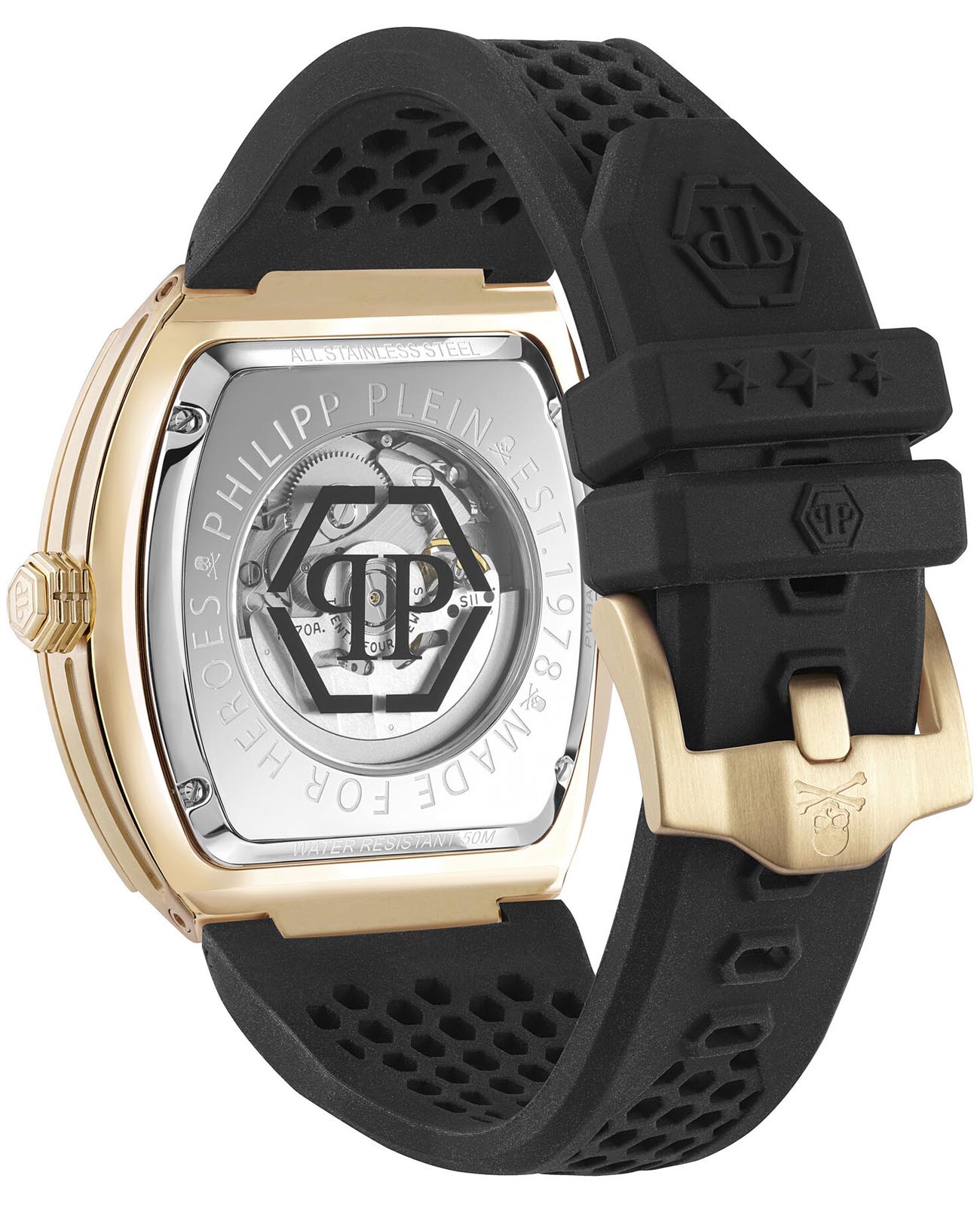 Мужские механические часы-скелетоны Philipp Plein The Skeleton PWBAA1623. Корпус часов изготовлен из нержавеющей стали с IP-покрытиемIP-покрытиеМетод ионного напыления. Демонстрирует повышенную устойчивость к истиранию, окислению и химическим веществам. Под воздействием высокого давления и температуры около 1500°C молекулы металла надёжно соединяются с частицами корпуса часов.. Минеральное стеклоМинеральное стеклоМинеральное стекло представляет собой искусственно выращенный минерал кварца. Такое стекло отличается особой устойчивостью к повреждениям и царапинам. Уступает по некоторым качествам сапфировому стеклу. устойчивое к мелким механическим повреждениям. Влагозащита: 50 метров, позволит защитить корпус от случайных брызг или капель дождя. Стрелки с люминесцентным покрытиемЛюминесцентное покрытиеПозволяет считывать показания времени в темноте. Производители наносят на стрелки, часовые индексы, безель или поверхность циферблата светонакопительный состав, дающий холодное свечение.. Практичный ремешок из силикона на стандартной застёжке. БезельБезельВнешний ободок, закрепляющий стекло. В спортивных часах так называется поворотное кольцо с делениями на циферблате, выполняет роль таймера – замеряет отрезки времени на шкале. Неподвижный безель – элемент декора. Однонаправленно вращающийся безель на дайверских часах позволяет фиксировать моменты погружения и выныривания на поверхность. и циферблат инкрустированы цветными кристаллами Preciosa.