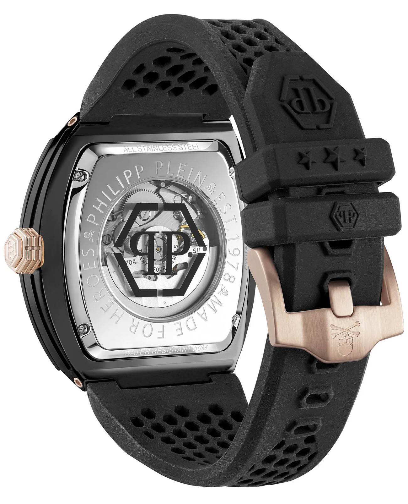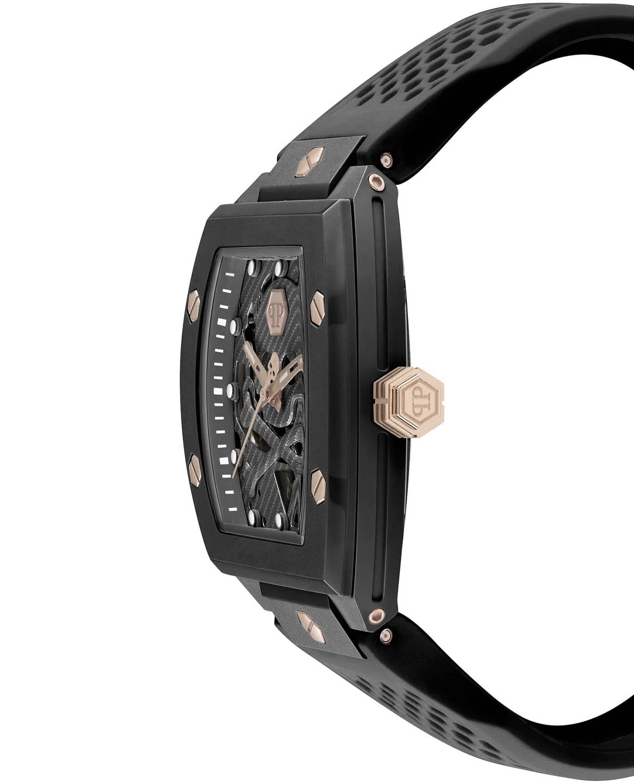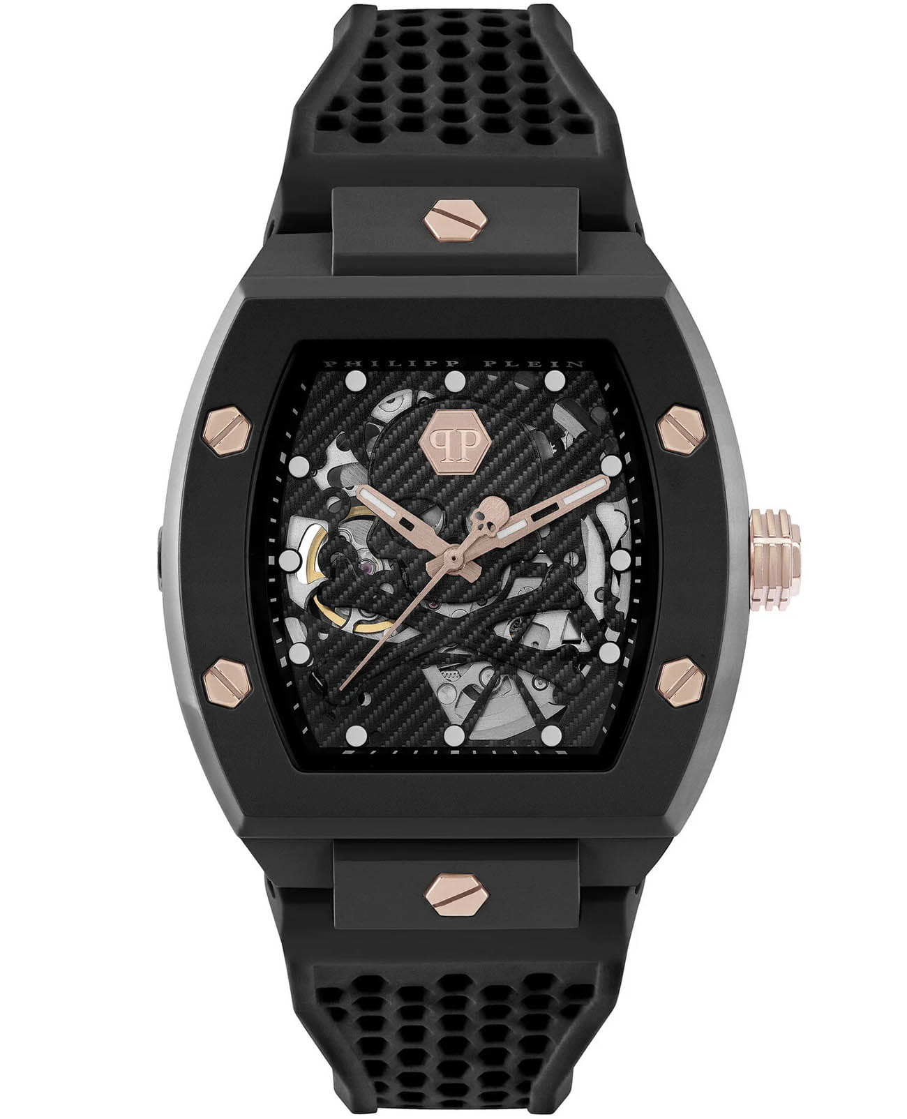 Мужские механические часы-скелетоны Philipp Plein The Skeleton PWVBA0523. Корпус часов изготовлен из экокерамики. Минеральное стеклоМинеральное стеклоМинеральное стекло представляет собой искусственно выращенный минерал кварца. Такое стекло отличается особой устойчивостью к повреждениям и царапинам. Уступает по некоторым качествам сапфировому стеклу. устойчивое к мелким механическим повреждениям. Влагозащита: 50 метров, позволит защитить корпус от случайных брызг или капель дождя. Стрелки и метки с люминесцентным покрытиемЛюминесцентное покрытиеПозволяет считывать показания времени в темноте. Производители наносят на стрелки, часовые индексы, безель или поверхность циферблата светонакопительный состав, дающий холодное свечение.. Практичный ремешок из силикона на стандартной застёжке.