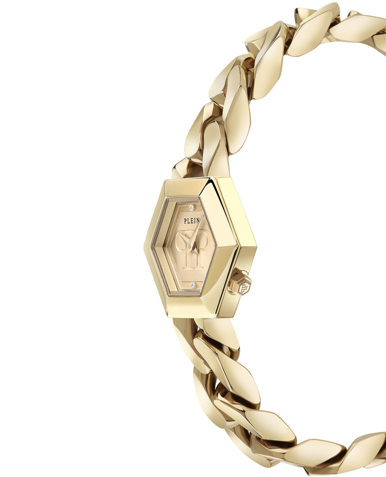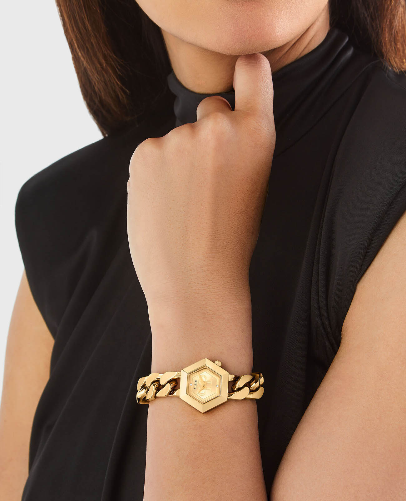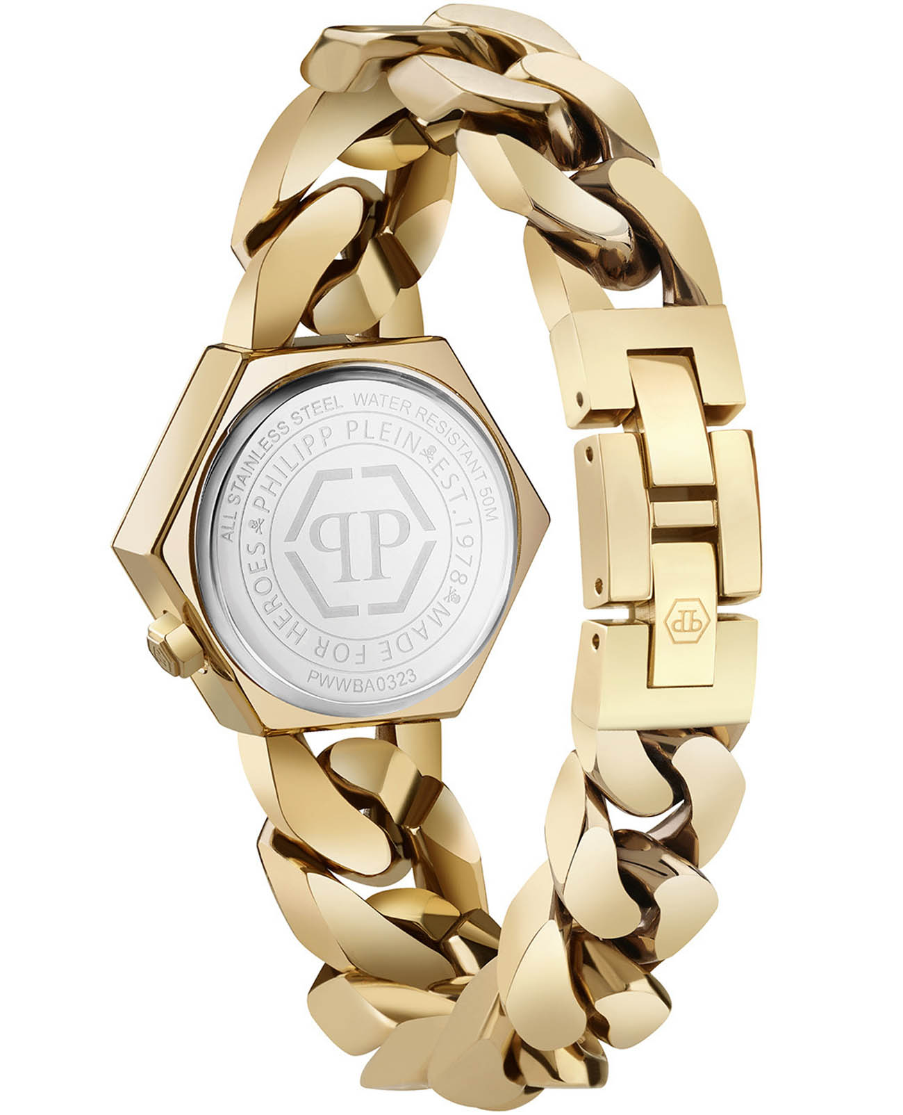 Стильные женские часы Philipp Plein The Hexagon PWWBA0323 с надежным кварцевым механизмом. Корпус и браслет часов изготовлены из нержавеющей стали с IP-покрытиемIP-покрытиеМетод ионного напыления. Демонстрирует повышенную устойчивость к истиранию, окислению и химическим веществам. Под воздействием высокого давления и температуры около 1500°C молекулы металла надёжно соединяются с частицами корпуса часов.. Минеральное стеклоМинеральное стеклоМинеральное стекло представляет собой искусственно выращенный минерал кварца. Такое стекло отличается особой устойчивостью к повреждениям и царапинам. Уступает по некоторым качествам сапфировому стеклу. устойчивое к мелким механическим повреждениям. Влагозащита: 50 метров, позволит защитить корпус от случайных брызг или капель дождя. Циферблат инкрустирован кристаллами Preciosa.