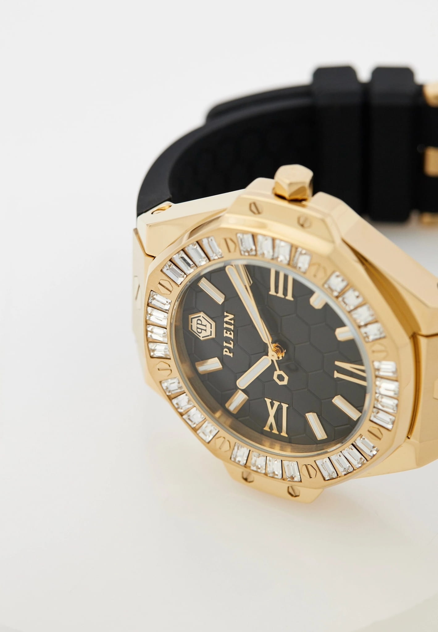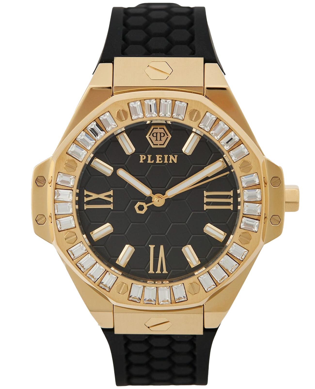Philipp Plein Plein Lady Royal PWBDA0424 — женские часы, сочетающие элегантный дизайн и функциональность. Корпус диаметром 39 мм выполнен из нержавеющей стали с золотистым PVD-покрытиемPVDУльтратонкое покрытие наносится в технике вакуумного напыления, сочетает в себе нитрид титана особой прочности со слоем золота или оксида хрома. Несёт в себе декоративную или защитную функцию., что придаёт часам изысканный вид. Минеральное стеклоМинеральное стеклоМинеральное стекло представляет собой искусственно выращенный минерал кварца. Такое стекло отличается особой устойчивостью к повреждениям и царапинам. Уступает по некоторым качествам сапфировому стеклу. защищает циферблат от царапин и повреждений, сохраняя его безупречный внешний вид. Циферблат инкрустирован кристаллами. Чёрный циферблат с шестиугольной текстурой подчёркивает уникальный стиль бренда. Часы оснащены кварцевым механизмом, обеспечивающим точность хода. Водозащита до 5 ATM (50 метров) делает их подходящими для повседневного использования. Ремешок из чёрного силикона гарантирует комфорт при ношении, а классическая застёжка обеспечивает надёжную фиксацию. Ширина ремешка 16 мм гармонично сочетается с размером корпуса, завершая смелый и современный образ.