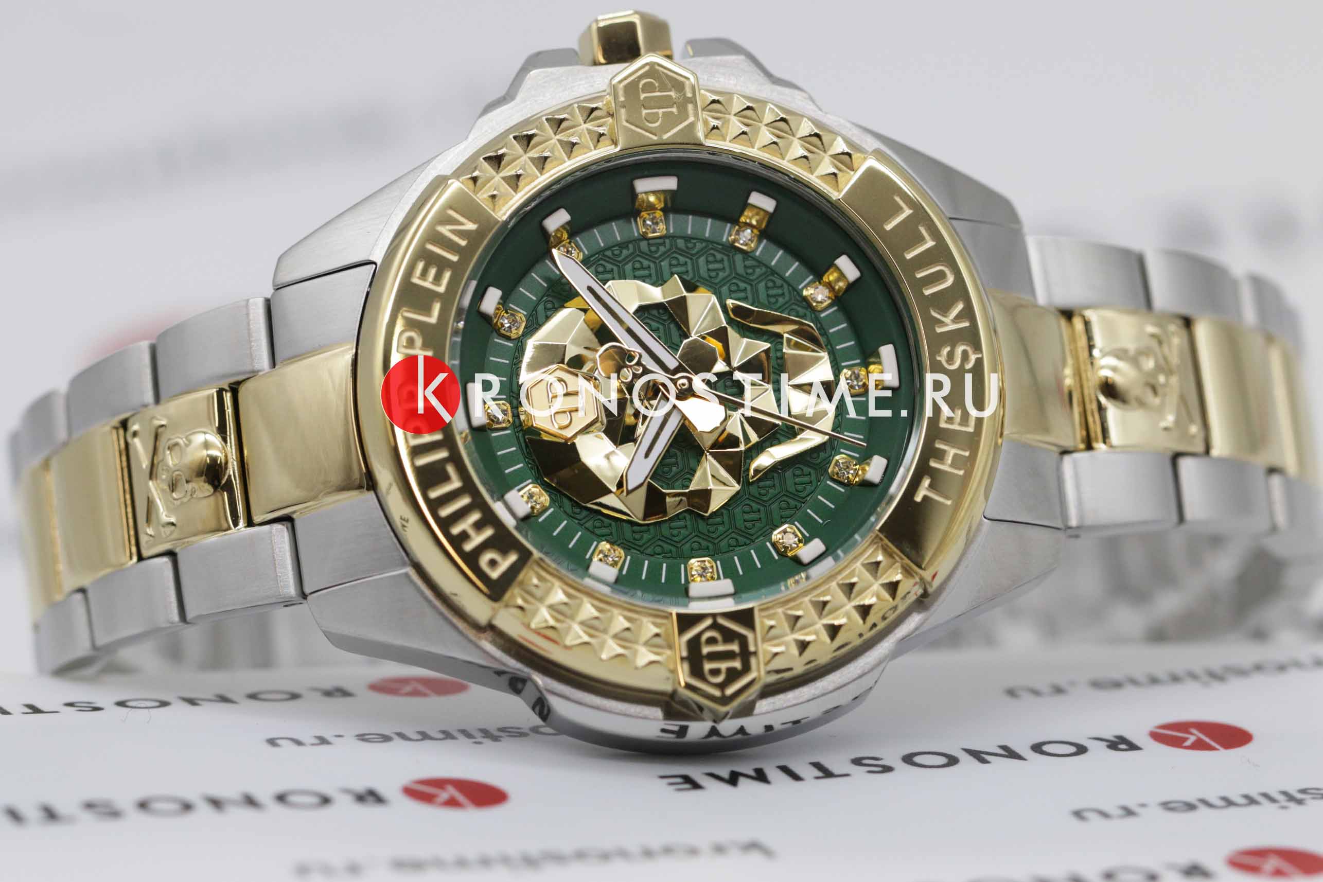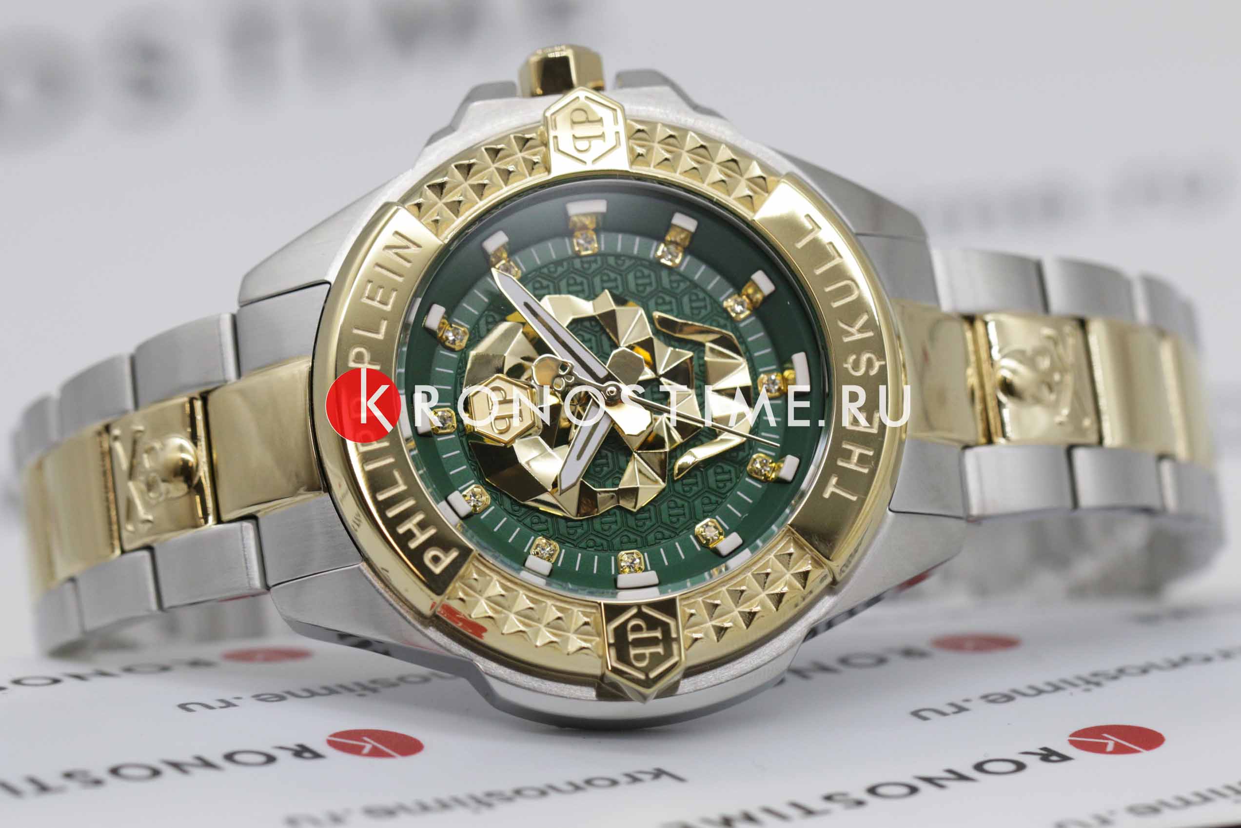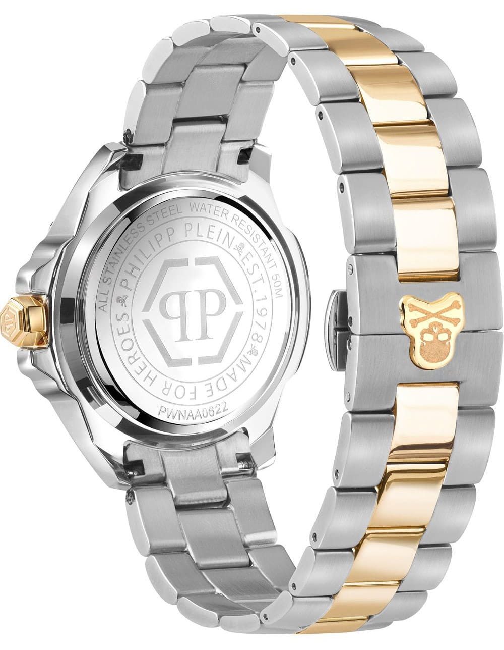 Яркие унисекс часы с минеральным стекломМинеральное стеклоМинеральное стекло представляет собой искусственно выращенный минерал кварца. Такое стекло отличается особой устойчивостью к повреждениям и царапинам. Уступает по некоторым качествам сапфировому стеклу. Philipp Plein The Skull PWNAA0622, кварцевый механизм с высокой точностью. Класс водозащиты: 50 метров, позволит защитить корпус от случайных брызг или капель дождя. Корпус часов изготовлен из стали с IP-покрытиемIP-покрытиеМетод ионного напыления. Демонстрирует повышенную устойчивость к истиранию, окислению и химическим веществам. Под воздействием высокого давления и температуры около 1500°C молекулы металла надёжно соединяются с частицами корпуса часов.. Круглый стальной корпус.. Циферблат дополнен трехмерным граненым черепом. Шестигранная заводная головка с защитой. Застёжка бабочка с кнопкамиЗастёжка "бабочка"Такой вид застёжки дополняется предохранителями, помогающими избежать случайного раскрытия браслета. Обладают изящным исполнением. .