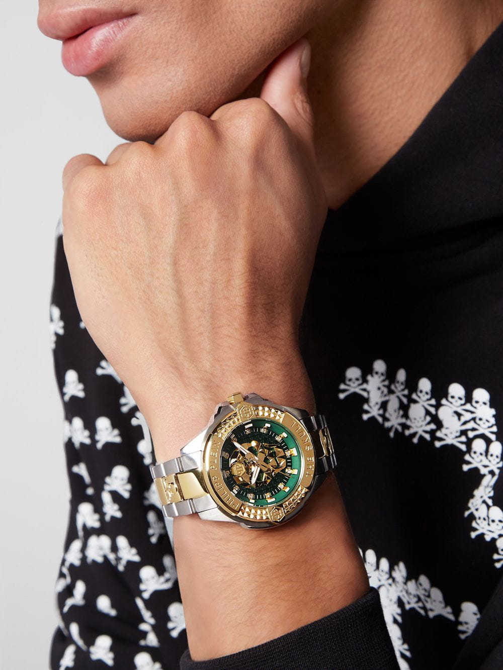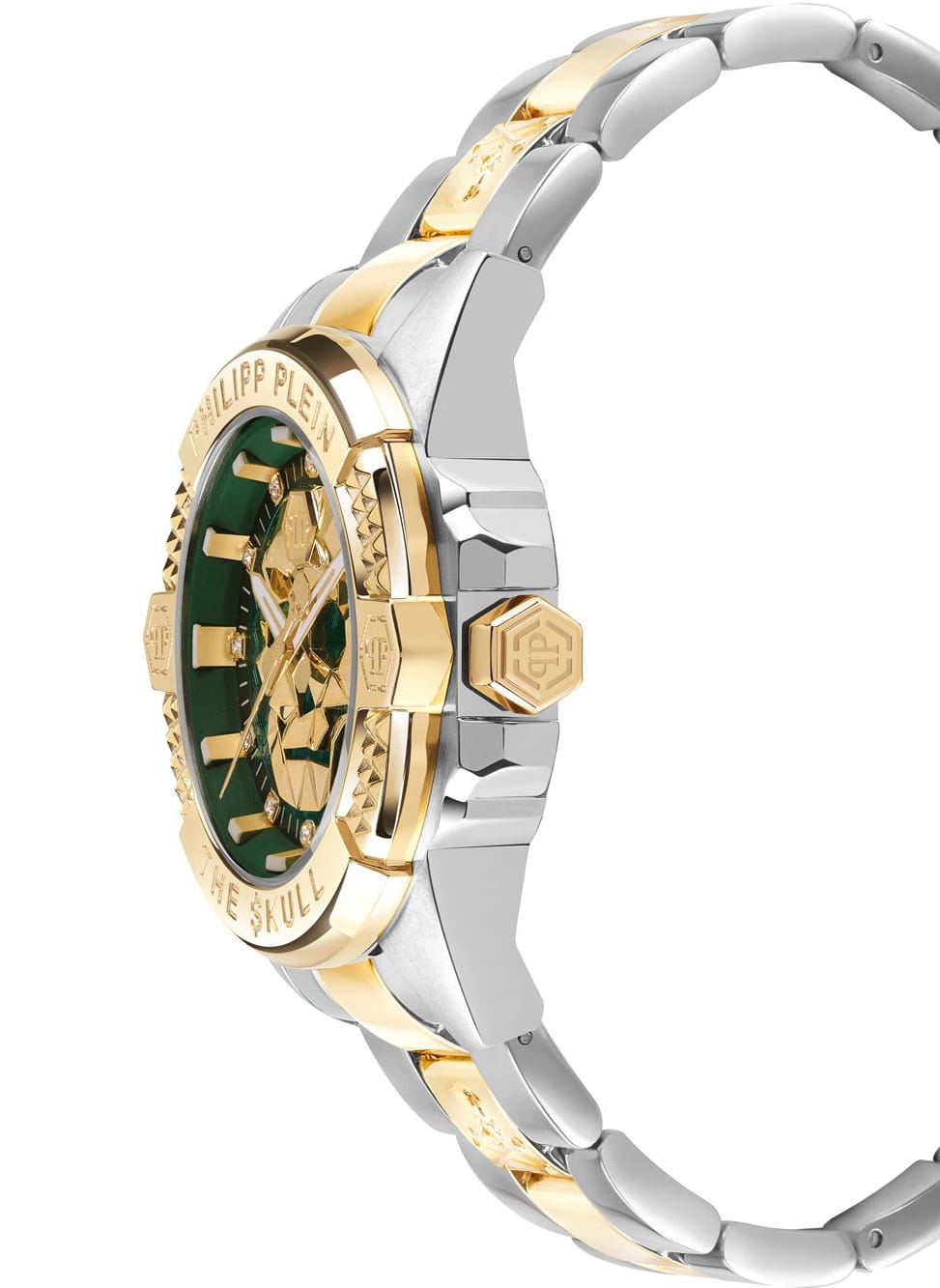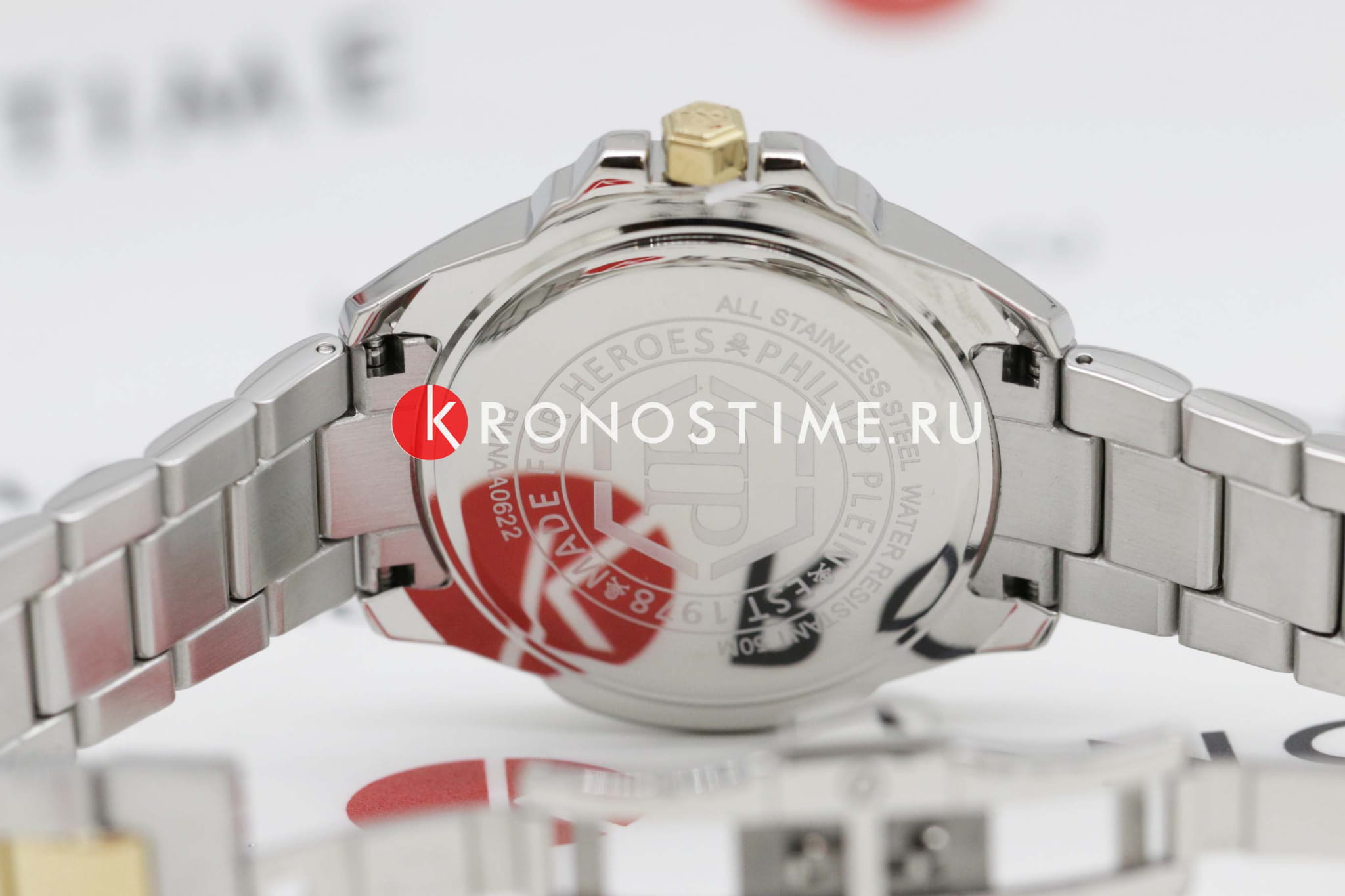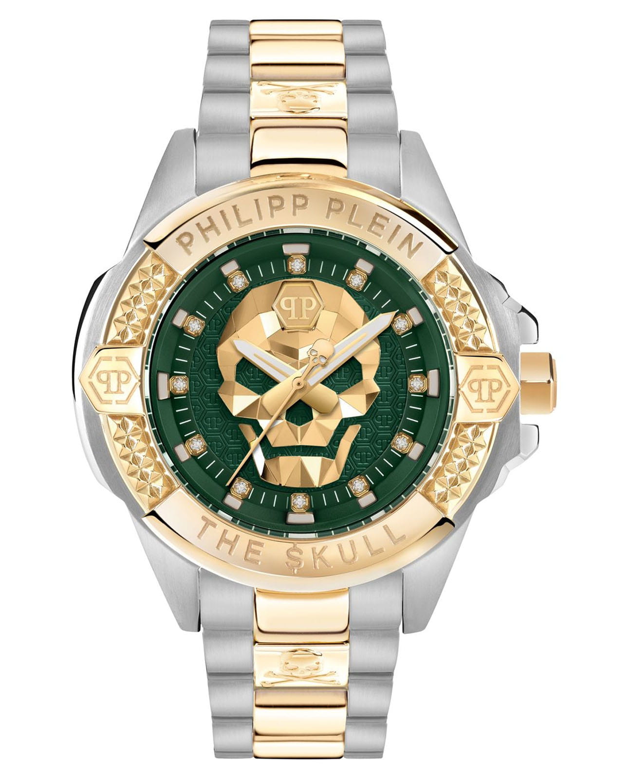 Яркие унисекс часы с минеральным стекломМинеральное стеклоМинеральное стекло представляет собой искусственно выращенный минерал кварца. Такое стекло отличается особой устойчивостью к повреждениям и царапинам. Уступает по некоторым качествам сапфировому стеклу. Philipp Plein The Skull PWNAA0622, кварцевый механизм с высокой точностью. Класс водозащиты: 50 метров, позволит защитить корпус от случайных брызг или капель дождя. Корпус часов изготовлен из стали с IP-покрытиемIP-покрытиеМетод ионного напыления. Демонстрирует повышенную устойчивость к истиранию, окислению и химическим веществам. Под воздействием высокого давления и температуры около 1500°C молекулы металла надёжно соединяются с частицами корпуса часов.. Круглый стальной корпус.. Циферблат дополнен трехмерным граненым черепом. Шестигранная заводная головка с защитой. Застёжка бабочка с кнопкамиЗастёжка "бабочка"Такой вид застёжки дополняется предохранителями, помогающими избежать случайного раскрытия браслета. Обладают изящным исполнением. .