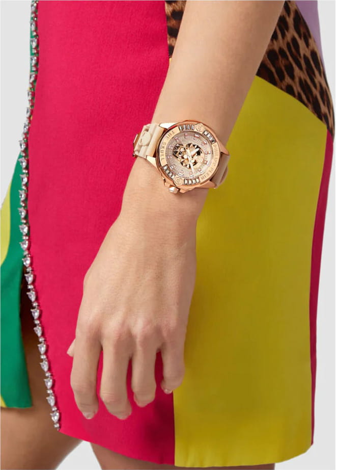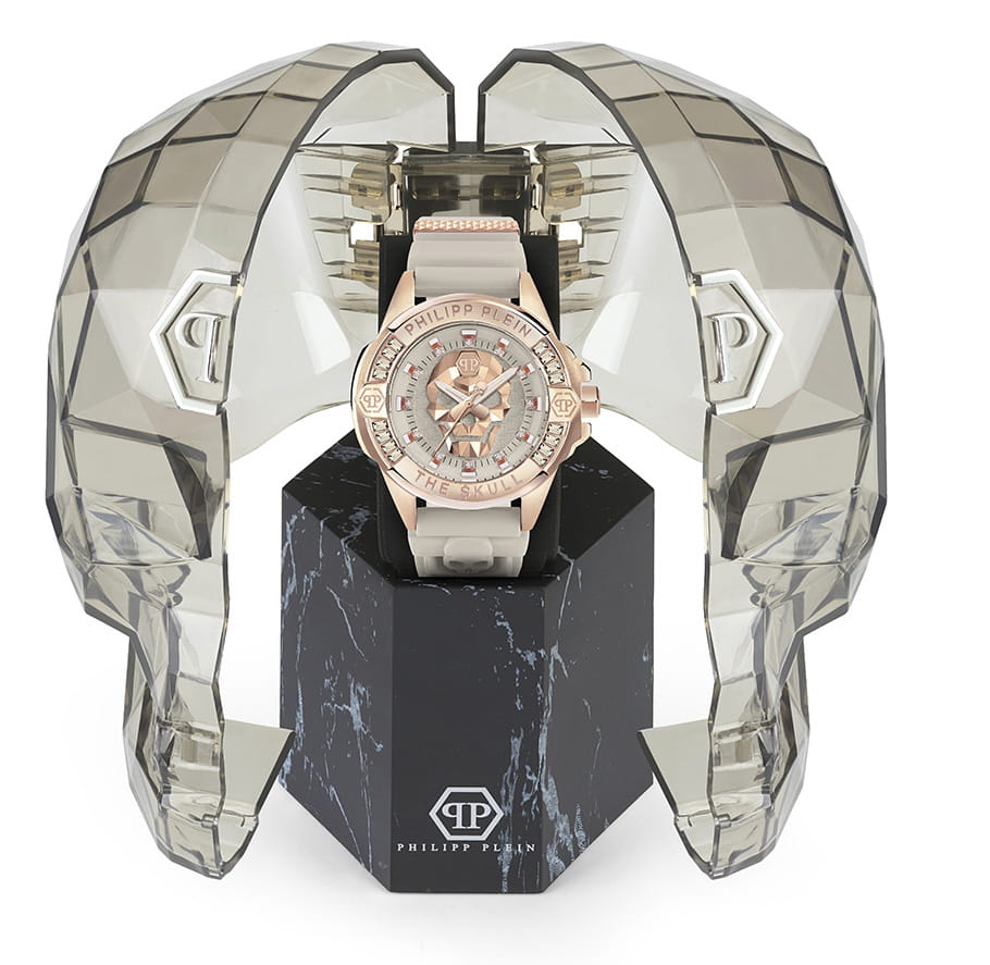 Яркие женские часы с минеральным стекломМинеральное стеклоМинеральное стекло представляет собой искусственно выращенный минерал кварца. Такое стекло отличается особой устойчивостью к повреждениям и царапинам. Уступает по некоторым качествам сапфировому стеклу. Philipp Plein The Skull PWNAA1323, кварцевый механизм с высокой точностью. Класс водозащиты: 50 метров, позволит защитить корпус от случайных брызг или капель дождя. Корпус часов изготовлен из стали с IP-покрытиемIP-покрытиеМетод ионного напыления. Демонстрирует повышенную устойчивость к истиранию, окислению и химическим веществам. Под воздействием высокого давления и температуры около 1500°C молекулы металла надёжно соединяются с частицами корпуса часов.. Круглый стальной корпус украшен кристаллами Swarovski. Циферблат с метками в виде точек украшенных кристаллами Swarovski, дополнен объемным черепом. Шестигранная заводная головка с защитой. Силиконовый ремешок украшен объемным черепом.