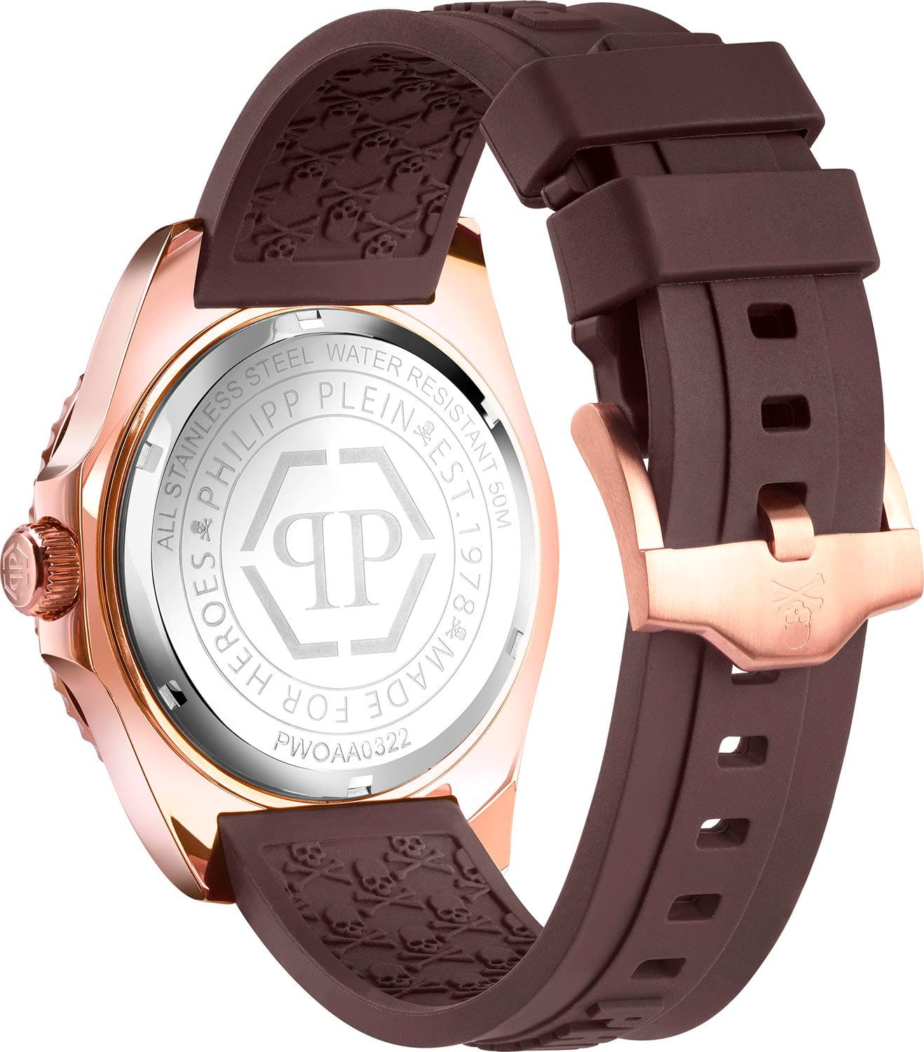 Яркие мужские часы с минеральным стекломМинеральное стеклоМинеральное стекло представляет собой искусственно выращенный минерал кварца. Такое стекло отличается особой устойчивостью к повреждениям и царапинам. Уступает по некоторым качествам сапфировому стеклу. Philipp Plein The Skull PWOAA0322, кварцевый механизм с высокой точностью. Класс водозащиты: 50 метров, позволит защитить корпус от случайных брызг или капель дождя. Корпус часов изготовлен из стали с IP-покрытиемIP-покрытиеМетод ионного напыления. Демонстрирует повышенную устойчивость к истиранию, окислению и химическим веществам. Под воздействием высокого давления и температуры около 1500°C молекулы металла надёжно соединяются с частицами корпуса часов.. Стрелки и метки с люминесцентным покрытиемЛюминесцентное покрытиеПозволяет считывать показания времени в темноте. Производители наносят на стрелки, часовые индексы, безель или поверхность циферблата светонакопительный состав, дающий холодное свечение.. Часы с раскладной застёжкойРаскладная застёжкаТакой тип застёжки используется только на браслетах из металла. Она никогда не раскрывается полностью, происходит разделение на 2 и более частей. Раскладывающая застёжка снизит вероятность потери часов к минимуму.