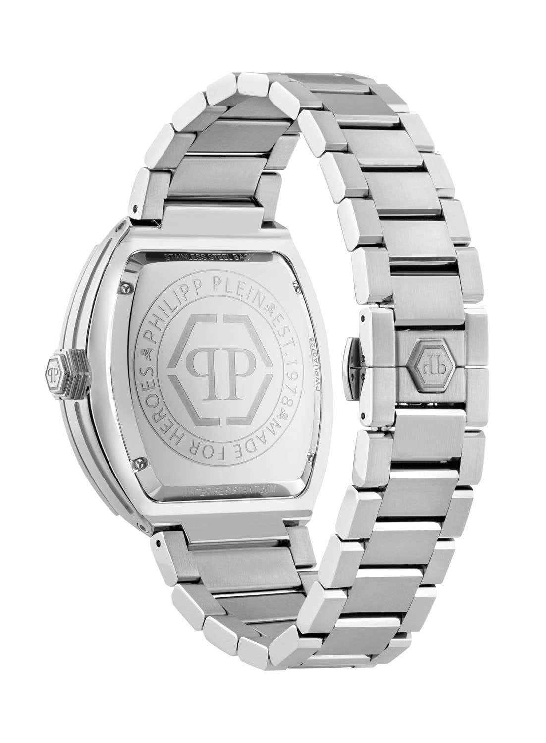 Philipp Plein Hexagon Phantom PWPUA0725 - часы в современном дизайне несомненно добавят вам выразительности и станут главным акцентом вашего стильного образа. Мужские кварцевые часы с высокой точностью. Стальной корпус серебристого цвета, диаметром 44 мм. Циферблат декорирован логотипом бренда, метки в виде штрихов. Минеральное стеклоМинеральное стеклоМинеральное стекло представляет собой искусственно выращенный минерал кварца. Такое стекло отличается особой устойчивостью к повреждениям и царапинам. Уступает по некоторым качествам сапфировому стеклу. защищает циферблат от царапин. Люминесцентное покрытиеЛюминесцентное покрытиеПозволяет считывать показания времени в темноте. Производители наносят на стрелки, часовые индексы, безель или поверхность циферблата светонакопительный состав, дающий холодное свечение. стрелок и меток позволит следить за временем даже в полной темноте. Окошко даты находится в положении 6 часов. Стальной браслет на застёжке-бабочке с кнопкамиЗастёжка "бабочка"Такой вид застёжки дополняется предохранителями, помогающими избежать случайного раскрытия браслета. Обладают изящным исполнением. , обеспечивает комфортное ношение. Граненая заводная головка. Влагозащита: 50 метров, позволит защитить корпус от случайных брызг или капель дождя. Идеальный аксессуар для тех, кто ценит индивидуальность и не боится выделяться из толпы.