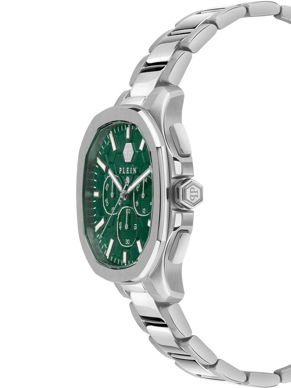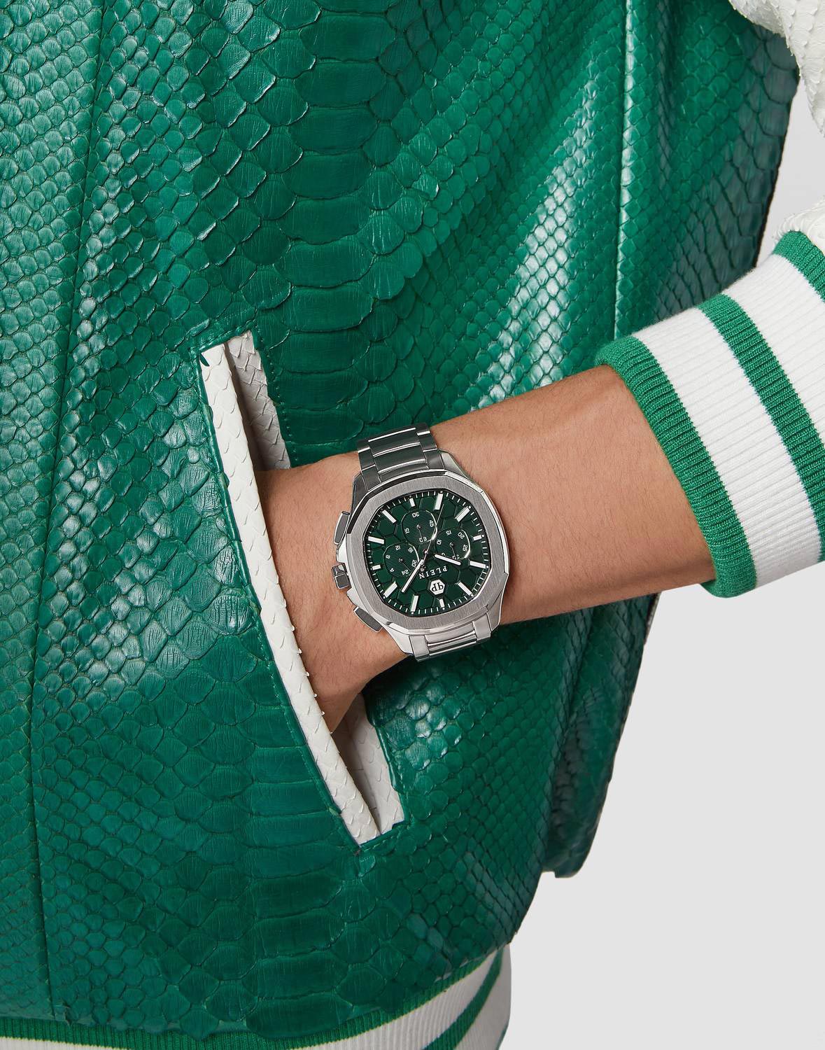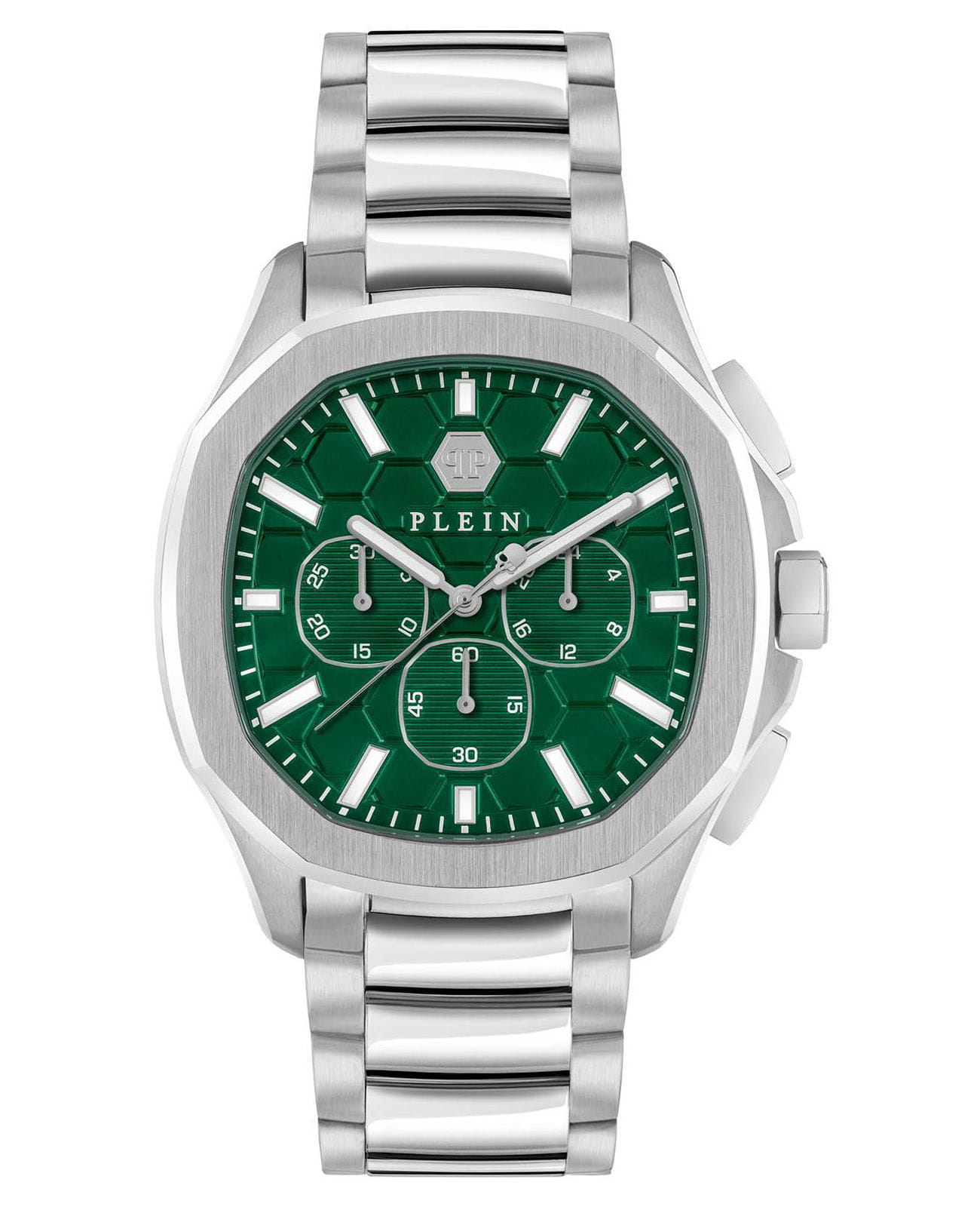 Яркие мужские часы-хронографХронографФункция позволяет измерять отрезки времени с особой точностью: часы, минуты, секунды. Верным признаком хронографа является наличие на циферблате 3 дополнительных окошек-счётчиков. с секундомеромСекундомерСекундоме́р — прибор, способный измерять интервалы времени с точностью до долей секунды.  Philipp Plein PWSAA0223, кварцевый механизм с высокой точностью. Класс водозащиты: 50 метров, позволит защитить корпус от случайных брызг или капель дождя. Корпус часов изготовлен из стали. Стрелки и метки с люминесцентным покрытиемЛюминесцентное покрытиеПозволяет считывать показания времени в темноте. Производители наносят на стрелки, часовые индексы, безель или поверхность циферблата светонакопительный состав, дающий холодное свечение.. Застёжка бабочка с кнопкамиЗастёжка "бабочка"Такой вид застёжки дополняется предохранителями, помогающими избежать случайного раскрытия браслета. Обладают изящным исполнением.