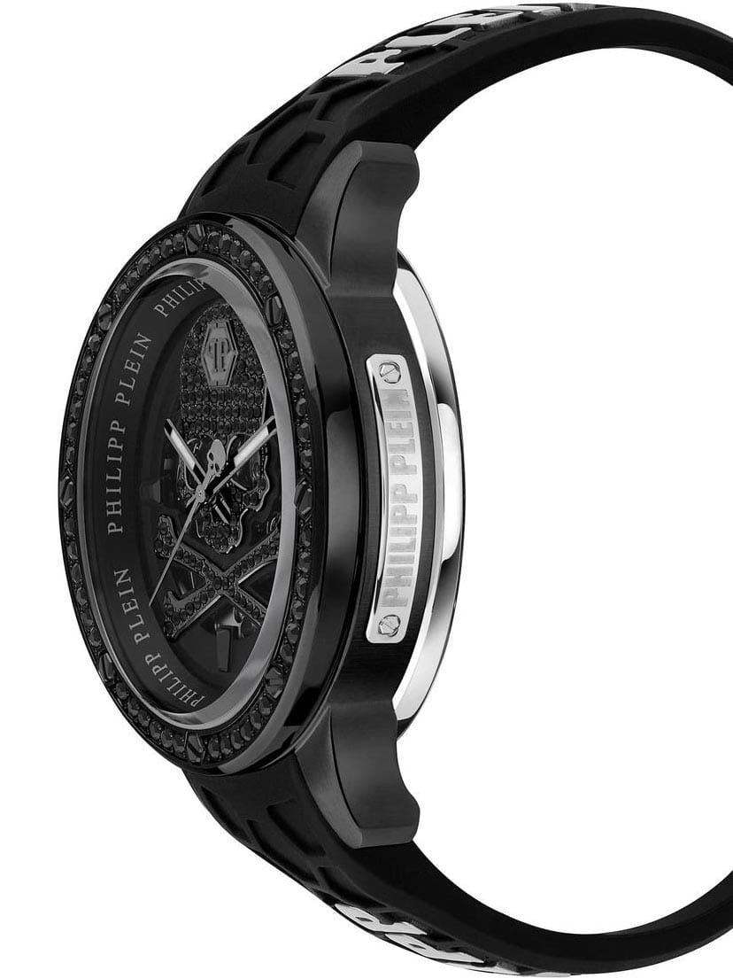 Яркие мужские часы с минеральным стекломМинеральное стеклоМинеральное стекло представляет собой искусственно выращенный минерал кварца. Такое стекло отличается особой устойчивостью к повреждениям и царапинам. Уступает по некоторым качествам сапфировому стеклу. Philipp Plein Plein Rich PWUAA0423, механический механизм с автоподзаводом.  Класс водозащиты: 50 метров, позволит защитить корпус от случайных брызг или капель дождя. Корпус часов изготовлен из стали с IP-покрытиемIP-покрытиеМетод ионного напыления. Демонстрирует повышенную устойчивость к истиранию, окислению и химическим веществам. Под воздействием высокого давления и температуры около 1500°C молекулы металла надёжно соединяются с частицами корпуса часов. и украшен кристаллами. Стрелки и метки с люминесцентным покрытиемЛюминесцентное покрытиеПозволяет считывать показания времени в темноте. Производители наносят на стрелки, часовые индексы, безель или поверхность циферблата светонакопительный состав, дающий холодное свечение..