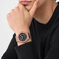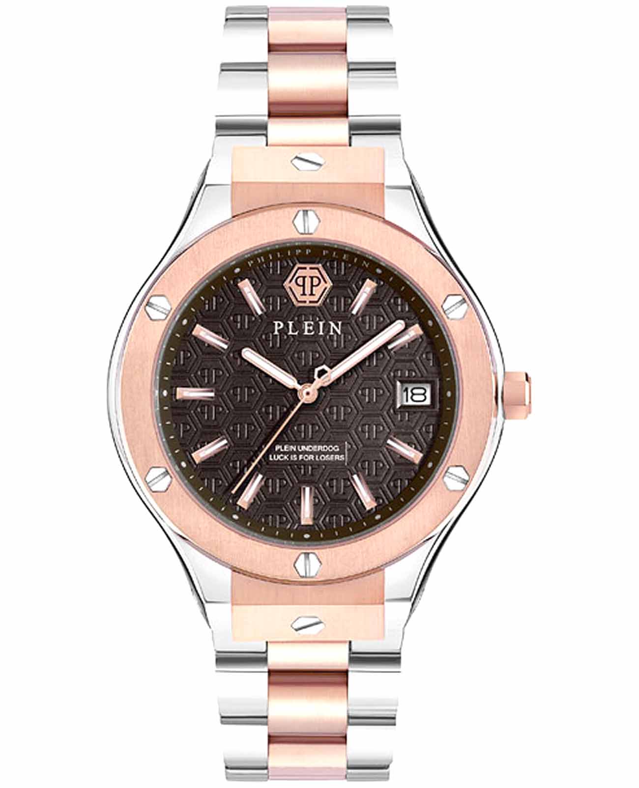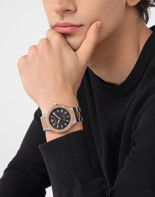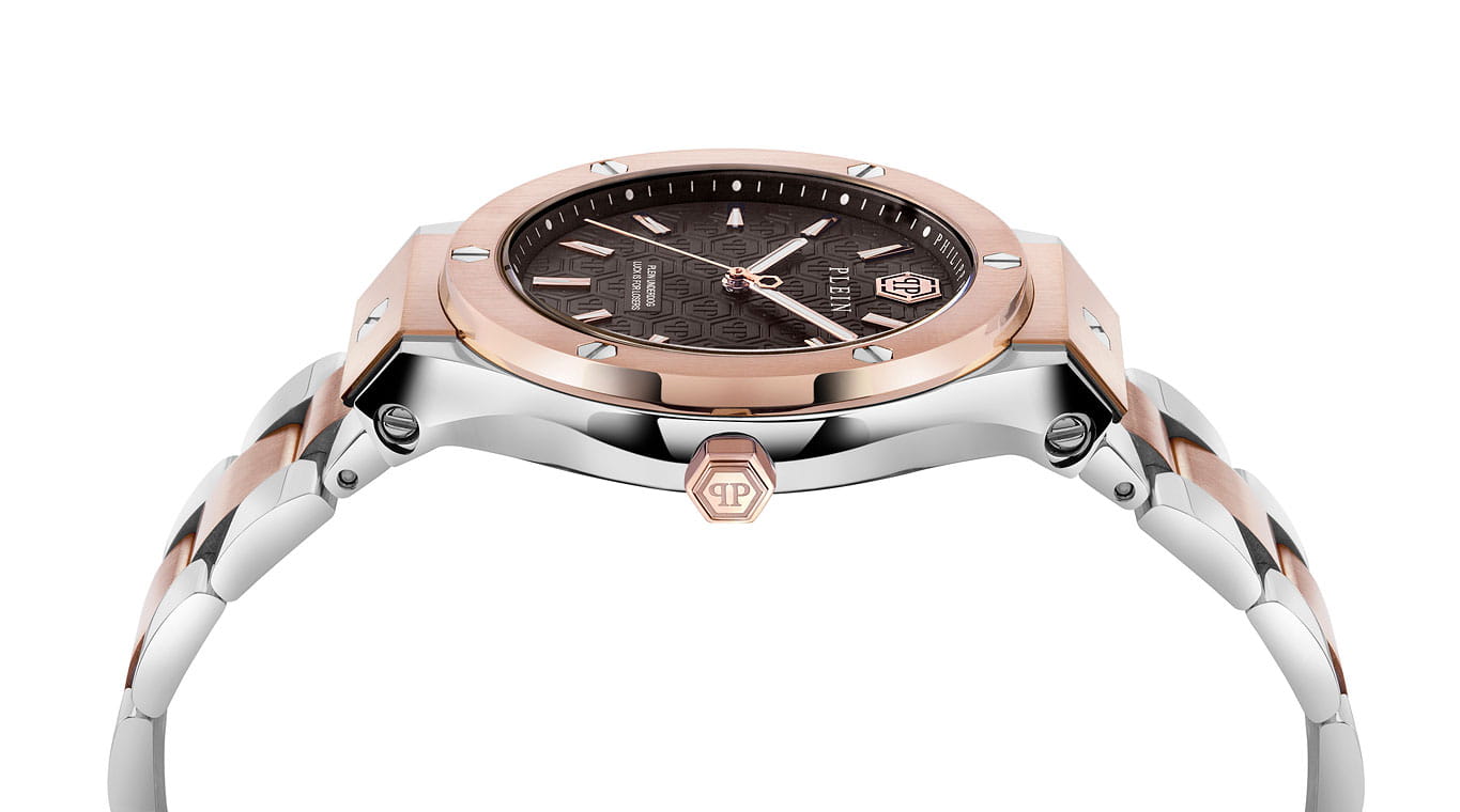 Philipp Plein Plein Underdog PWUFA0725 - это дерзкие и бескомпромиссные часы, воплощающие бунтарский дух бренда. Стальной корпус диаметром 44 мм. Стальной браслет на застёжке-бабочке с кнопкамиЗастёжка "бабочка"Такой вид застёжки дополняется предохранителями, помогающими избежать случайного раскрытия браслета. Обладают изящным исполнением. обеспечивает надёжную фиксацию и комфортное ношение. Люминесцентное покрытиеЛюминесцентное покрытиеПозволяет считывать показания времени в темноте. Производители наносят на стрелки, часовые индексы, безель или поверхность циферблата светонакопительный состав, дающий холодное свечение. стрелок и меток позволит следить за временем даже в полной темноте. Метки в виде штрихов. Минеральное стеклоМинеральное стеклоМинеральное стекло представляет собой искусственно выращенный минерал кварца. Такое стекло отличается особой устойчивостью к повреждениям и царапинам. Уступает по некоторым качествам сапфировому стеклу. защищает циферблат от царапин. Граненая заводная головка. БезельБезельВнешний ободок, закрепляющий стекло. В спортивных часах так называется поворотное кольцо с делениями на циферблате, выполняет роль таймера – замеряет отрезки времени на шкале. Неподвижный безель – элемент декора. Однонаправленно вращающийся безель на дайверских часах позволяет фиксировать моменты погружения и выныривания на поверхность. с PVD-покрытиемPVDУльтратонкое покрытие наносится в технике вакуумного напыления, сочетает в себе нитрид титана особой прочности со слоем золота или оксида хрома. Несёт в себе декоративную или защитную функцию.. Влагозащита: 50 метров, позволит защитить корпус от случайных брызг или капель дождя. Идеальный аксессуар для тех, кто ценит индивидуальность и не боится выделяться из толпы.