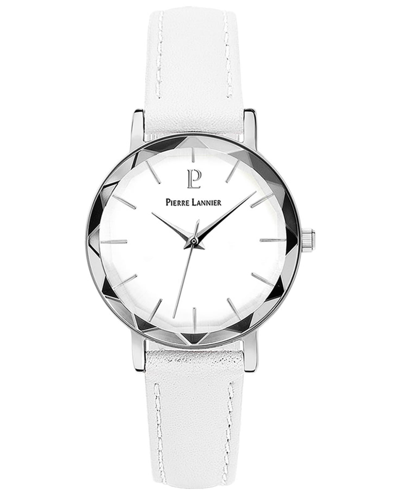 Женские кварцевые часы Pierre Lannier Multiples 009M600. Центральные часовая, минутная и секундная стрелки. Белый циферблат. Круглый корпус выполнен из полированной нержавеющей стали с фактурой по безелюБезельВнешний ободок, закрепляющий стекло. В спортивных часах так называется поворотное кольцо с делениями на циферблате, выполняет роль таймера – замеряет отрезки времени на шкале. Неподвижный безель – элемент декора. Однонаправленно вращающийся безель на дайверских часах позволяет фиксировать моменты погружения и выныривания на поверхность.. Белый кожаный ремешок шириной 14 мм, стандартная застежка. Прочное минеральное стеклоМинеральное стеклоМинеральное стекло представляет собой искусственно выращенный минерал кварца. Такое стекло отличается особой устойчивостью к повреждениям и царапинам. Уступает по некоторым качествам сапфировому стеклу., устойчивое к мелким механическим повреждениям. Водостойкость: 50 метров, позволит защитить корпус от случайных брызг или капель дождя.