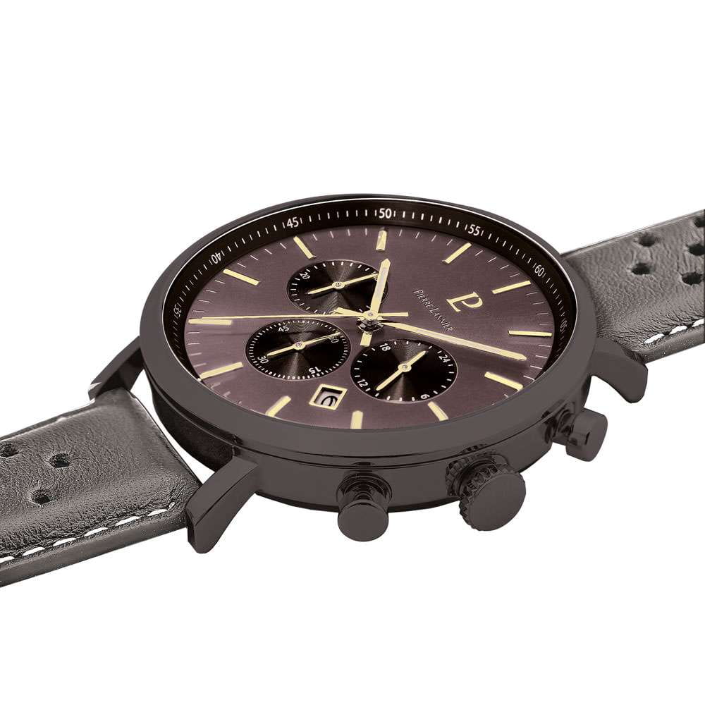 Pierre Lannier Baron 220H490 — выразительный мужской хронограф с индустриальной эстетикой. Диаметр корпуса — 43 мм, выполнен из нержавеющей стали с антрацитовым PVDPVDУльтратонкое покрытие наносится в технике вакуумного напыления, сочетает в себе нитрид титана особой прочности со слоем золота или оксида хрома. Несёт в себе декоративную или защитную функцию.-покрытием, придающим мужественный и современный вид . Циферблат графитового оттенка с эффектом «солнечного луча» украшен тремя функциональными счётчиками: 24‑часовые, секунднометрические и минутные — дополнены аккуратным окном даты между «4 и 5 часами». Чёткие часовые метки и стрелки в золотистом исполнении создают чёткий контраст с тёмным фоном . Циферблат защищён минеральным стекломМинеральное стеклоМинеральное стекло представляет собой искусственно выращенный минерал кварца. Такое стекло отличается особой устойчивостью к повреждениям и царапинам. Уступает по некоторым качествам сапфировому стеклу., устойчивым к повседневным воздействиям. Механизм — надёжный японский кварцевый Miyota (JS25) с функцией хронографа, простой в использовании и обслуживании Ремешок выполнен из перфорированной серой кожи классической ширины 20 мм, обеспечивая комфорт и дыхание коже. Завершён традиционной пряжкой. Водозащита до 5 ATM (≈50 м) позволяет спокойно носить часы в условиях случайных брызг и дождя Baron — это гармония строгого индустриального стиля, универсальности и точной функциональности хронографа, подчеркнутых качественным PVD-покрытием и практичными материалами.
