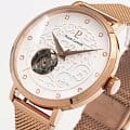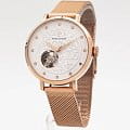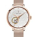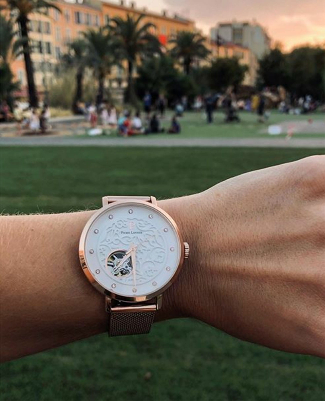 Женские механические часы с автоподзаводом Pierre Lannier Eolia 310F908. Минеральное стеклоМинеральное стеклоМинеральное стекло представляет собой искусственно выращенный минерал кварца. Такое стекло отличается особой устойчивостью к повреждениям и царапинам. Уступает по некоторым качествам сапфировому стеклу. устойчивое к мелким механическим повреждениям. Центральные часовая, минутная и секундная стрелки. Белый циферблат с открытым балансом хода украшен кристаллами Swarovski в местах часовых меток. Корпус и браслет выполнен из нержавеющей стали с IP-покрытиемIP-покрытиеМетод ионного напыления. Демонстрирует повышенную устойчивость к истиранию, окислению и химическим веществам. Под воздействием высокого давления и температуры около 1500°C молекулы металла надёжно соединяются с частицами корпуса часов..  Водостойкость: 50 метров, позволит защитить корпус от случайных брызг или капель дождя. Прозрачная задняя крышка. Браслет миланского плетения с раскладной застёжкойРаскладная застёжкаТакой тип застёжки используется только на браслетах из металла. Она никогда не раскрывается полностью, происходит разделение на 2 и более частей. Раскладывающая застёжка снизит вероятность потери часов к минимуму..