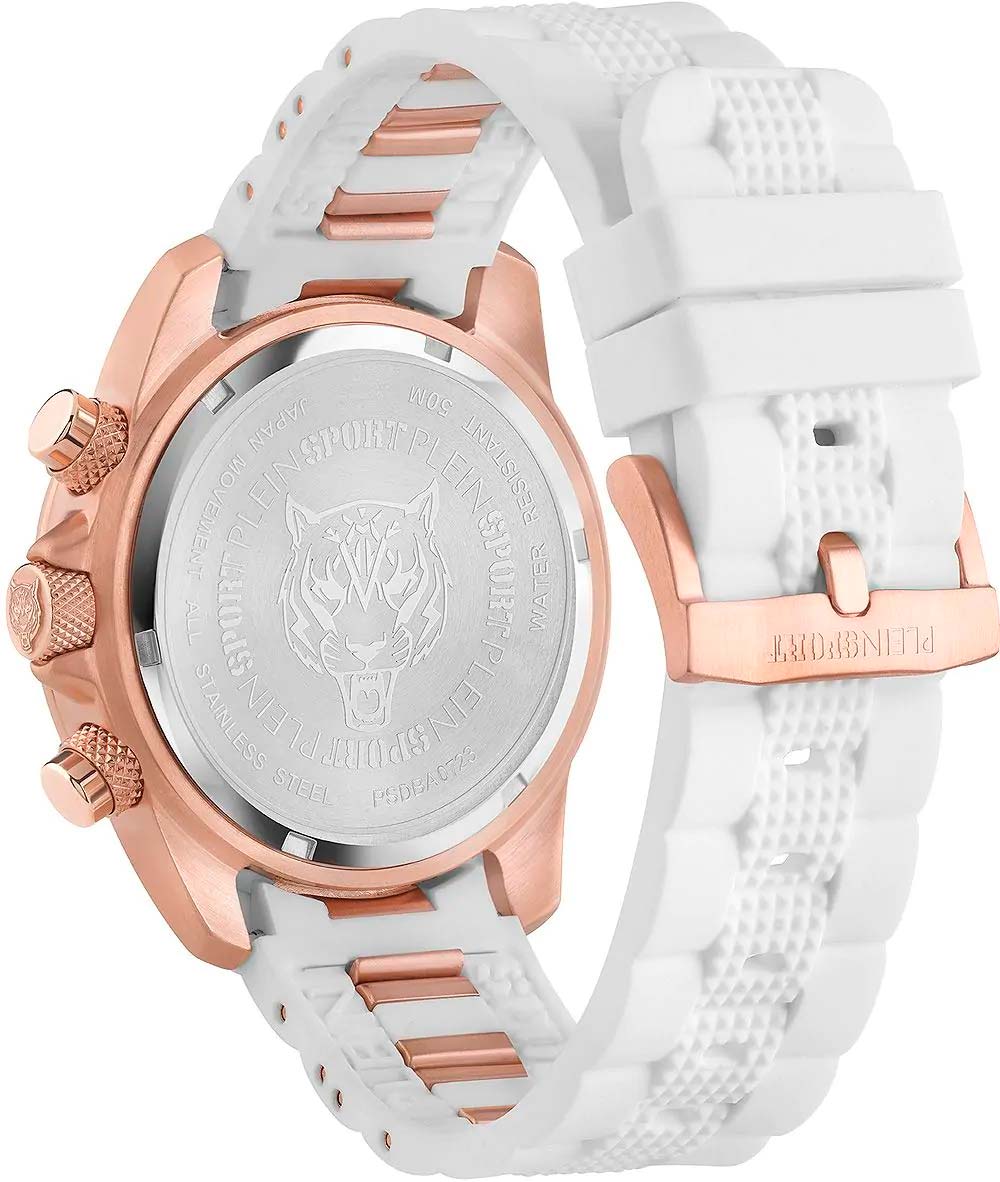 Немецкие кварцевые унисекс часы-хронографХронографФункция позволяет измерять отрезки времени с особой точностью: часы, минуты, секунды. Верным признаком хронографа является наличие на циферблате 3 дополнительных окошек-счётчиков. с секундомеромСекундомерСекундоме́р — прибор, способный измерять интервалы времени с точностью до долей секунды. Plein Sport Hurricane PSDBA0723, кварцевый механизм с высокой точностью. Класс водозащиты: 50 метров, позволит защитить корпус от случайных брызг или капель дождя. Корпус выполнен из стали с IP-покрытиемIP-покрытиеМетод ионного напыления. Демонстрирует повышенную устойчивость к истиранию, окислению и химическим веществам. Под воздействием высокого давления и температуры около 1500°C молекулы металла надёжно соединяются с частицами корпуса часов.. Стрелки и метки с люминесцентным покрытиемЛюминесцентное покрытиеПозволяет считывать показания времени в темноте. Производители наносят на стрелки, часовые индексы, безель или поверхность циферблата светонакопительный состав, дающий холодное свечение.. Силиконовый браслет на стандартной застежке. Минеральное стеклоМинеральное стеклоМинеральное стекло представляет собой искусственно выращенный минерал кварца. Такое стекло отличается особой устойчивостью к повреждениям и царапинам. Уступает по некоторым качествам сапфировому стеклу. устойчивое к мелким механическим повреждениям. Окошко даты находится в положении между 4 и 5 часов.