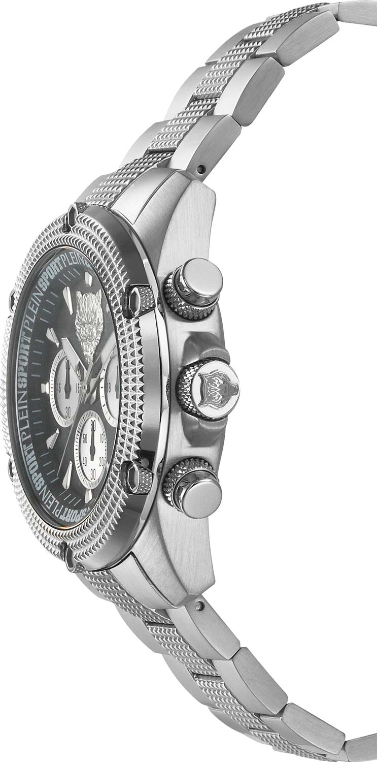 Немецкие мужские кварцевые часы-хронографХронографФункция позволяет измерять отрезки времени с особой точностью: часы, минуты, секунды. Верным признаком хронографа является наличие на циферблате 3 дополнительных окошек-счётчиков. с секундомеромСекундомерСекундоме́р — прибор, способный измерять интервалы времени с точностью до долей секунды. Plein Sport Hurricane PSDBA0823, кварцевый механизм с высокой точностью. Класс водозащиты: 50 метров, позволит защитить корпус от случайных брызг или капель дождя. Корпус выполнен из стали. Стальной браслет на раскладной застёжкеРаскладная застёжкаТакой тип застёжки используется только на браслетах из металла. Она никогда не раскрывается полностью, происходит разделение на 2 и более частей. Раскладывающая застёжка снизит вероятность потери часов к минимуму.. Минеральное стеклоМинеральное стеклоМинеральное стекло представляет собой искусственно выращенный минерал кварца. Такое стекло отличается особой устойчивостью к повреждениям и царапинам. Уступает по некоторым качествам сапфировому стеклу. устойчивое к мелким механическим повреждениям. Окошко даты находится в положении между 4 и 5 часов.