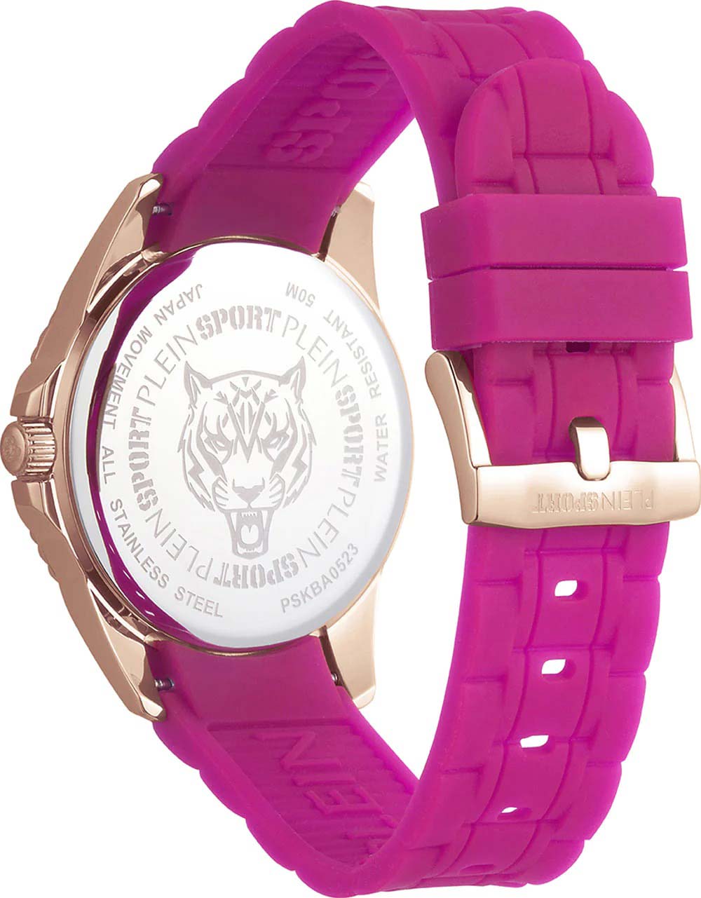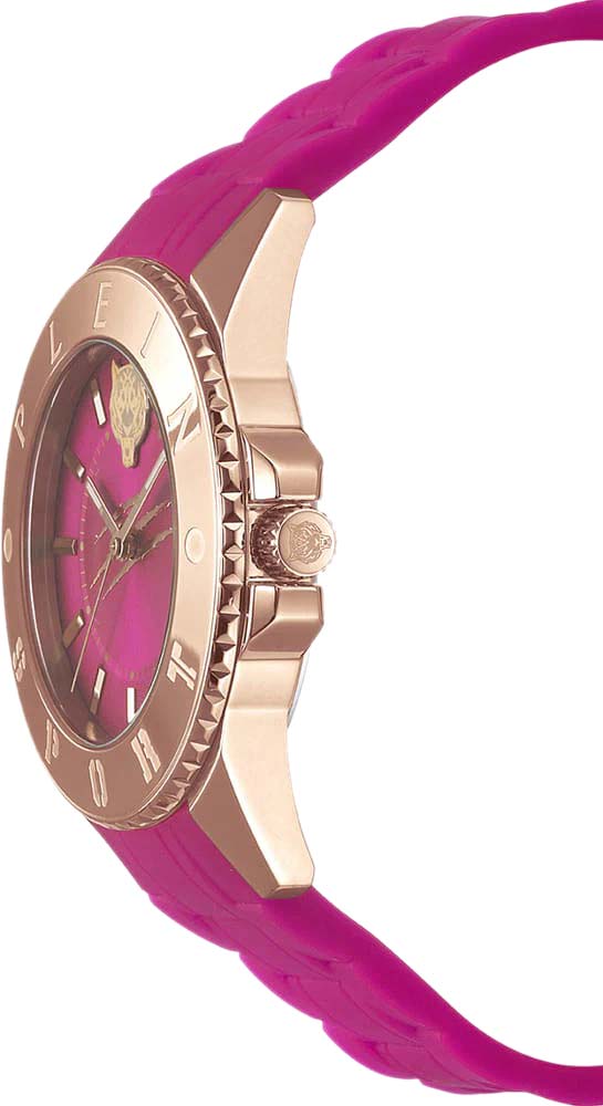 Немецкие женские кварцевые часы с минеральным стекломМинеральное стеклоМинеральное стекло представляет собой искусственно выращенный минерал кварца. Такое стекло отличается особой устойчивостью к повреждениям и царапинам. Уступает по некоторым качествам сапфировому стеклу. Plein Sport Glam PSKBA0523, кварцевый механизм с высокой точностью. Класс водозащиты: 50 метров, позволит защитить корпус от случайных брызг или капель дождя. Корпус часов изготовлен из стали  с IP-покрытиемIP-покрытиеМетод ионного напыления. Демонстрирует повышенную устойчивость к истиранию, окислению и химическим веществам. Под воздействием высокого давления и температуры около 1500°C молекулы металла надёжно соединяются с частицами корпуса часов.. Силиконовый ремешок на стандартной застёжке. Стрелки с люминесцентным покрытиемЛюминесцентное покрытиеПозволяет считывать показания времени в темноте. Производители наносят на стрелки, часовые индексы, безель или поверхность циферблата светонакопительный состав, дающий холодное свечение..