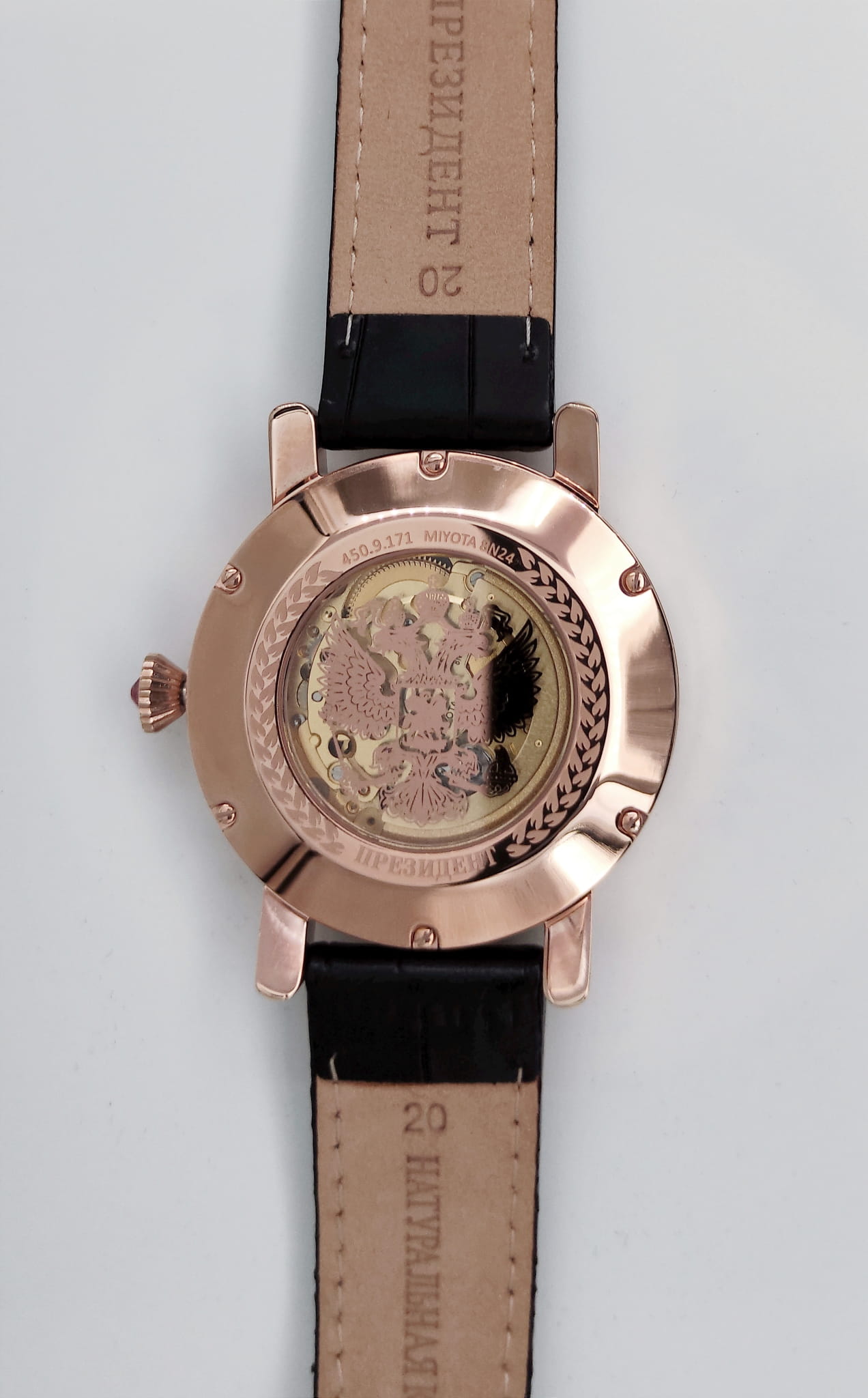 Часы «Президент» модели 4509171 — это мужские механические наручные часы с автоподзаводом, сочетающие элегантный дизайн и надёжность. Механизм: японский механизм Miyota с автоподзаводом, обеспечивающий точность и долговечность. Функции: часы, минуты, секунды. Корпус: из нержавеющей стали с PVD-покрытиемPVDУльтратонкое покрытие наносится в технике вакуумного напыления, сочетает в себе нитрид титана особой прочности со слоем золота или оксида хрома. Несёт в себе декоративную или защитную функцию., диаметром 42 мм. Стекло: минеральноеМинеральное стеклоМинеральное стекло представляет собой искусственно выращенный минерал кварца. Такое стекло отличается особой устойчивостью к повреждениям и царапинам. Уступает по некоторым качествам сапфировому стеклу., устойчивое к царапинам. Ремешок: кожаный, обеспечивающий комфорт при ношении. Эти часы станут идеальным выбором для тех, кто ценит стиль, качество и надёжность.