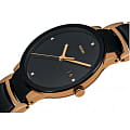Круглый циферблат чёрного цвета выполнен в стиле минимализм. Он инкрустирован 4 бриллиантами весом в 0,011 карат, переливающиеся сияющие грани придают модели роскоши и великолепие. Оригинальный браслет из нержавеющей стали 316L имеет вставки из высокотехнологичной керамикиВысокотехнологичная керамикаИнновационный запатентованный Rado материал с гладкой или матовой поверхностью. Керамика за счёт кристаллической структуры обладает повышенной устойчивостью от возникновения царапин. Материал способен принимать температуру тела человека, обеспечивая невероятный комфорт при ношении.. Наручные часы оснащены кварцевым механизмом ETA 955.112 с высокой точностью хода. Надёжное стекло из сапфира. PVD-покрытиеPVDУльтратонкое покрытие наносится в технике вакуумного напыления, сочетает в себе нитрид титана особой прочности со слоем золота или оксида хрома. Несёт в себе декоративную или защитную функцию. цвета розового золота. Апертура даты. Диаметр корпуса: 38 мм.