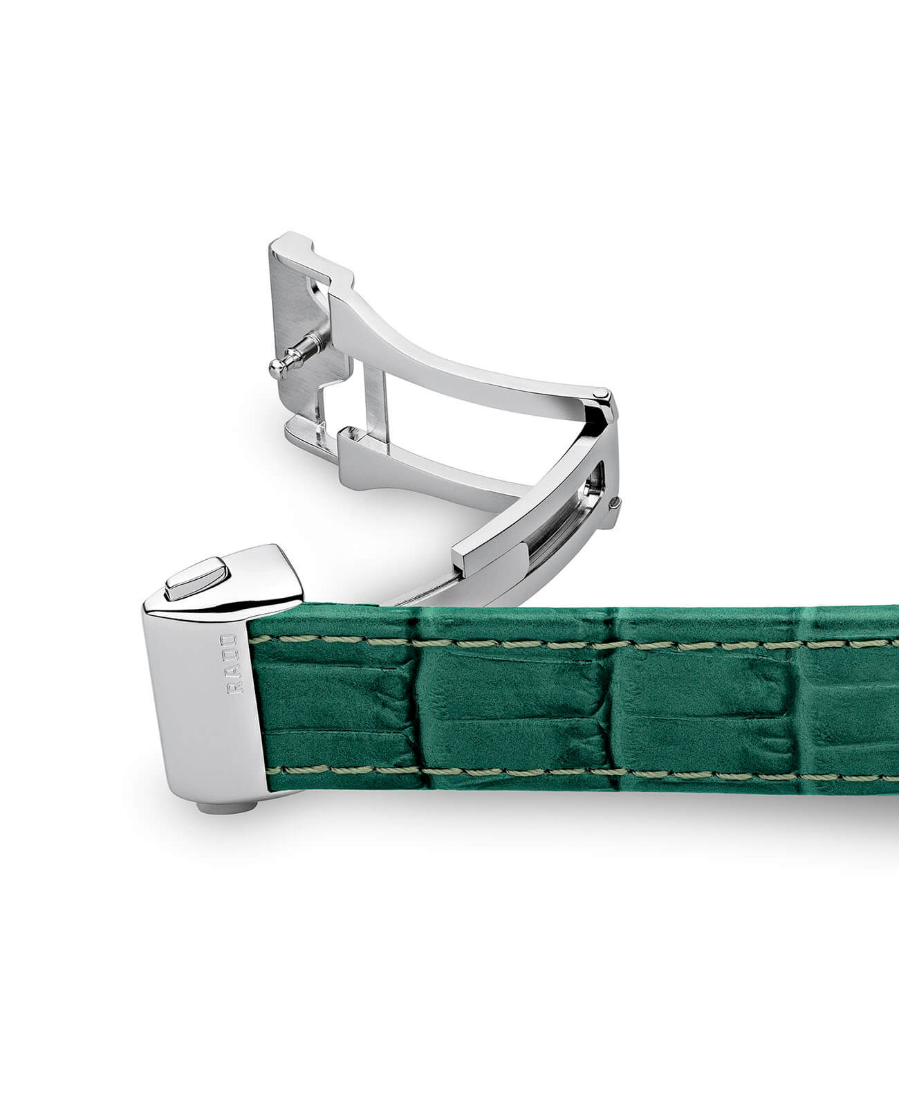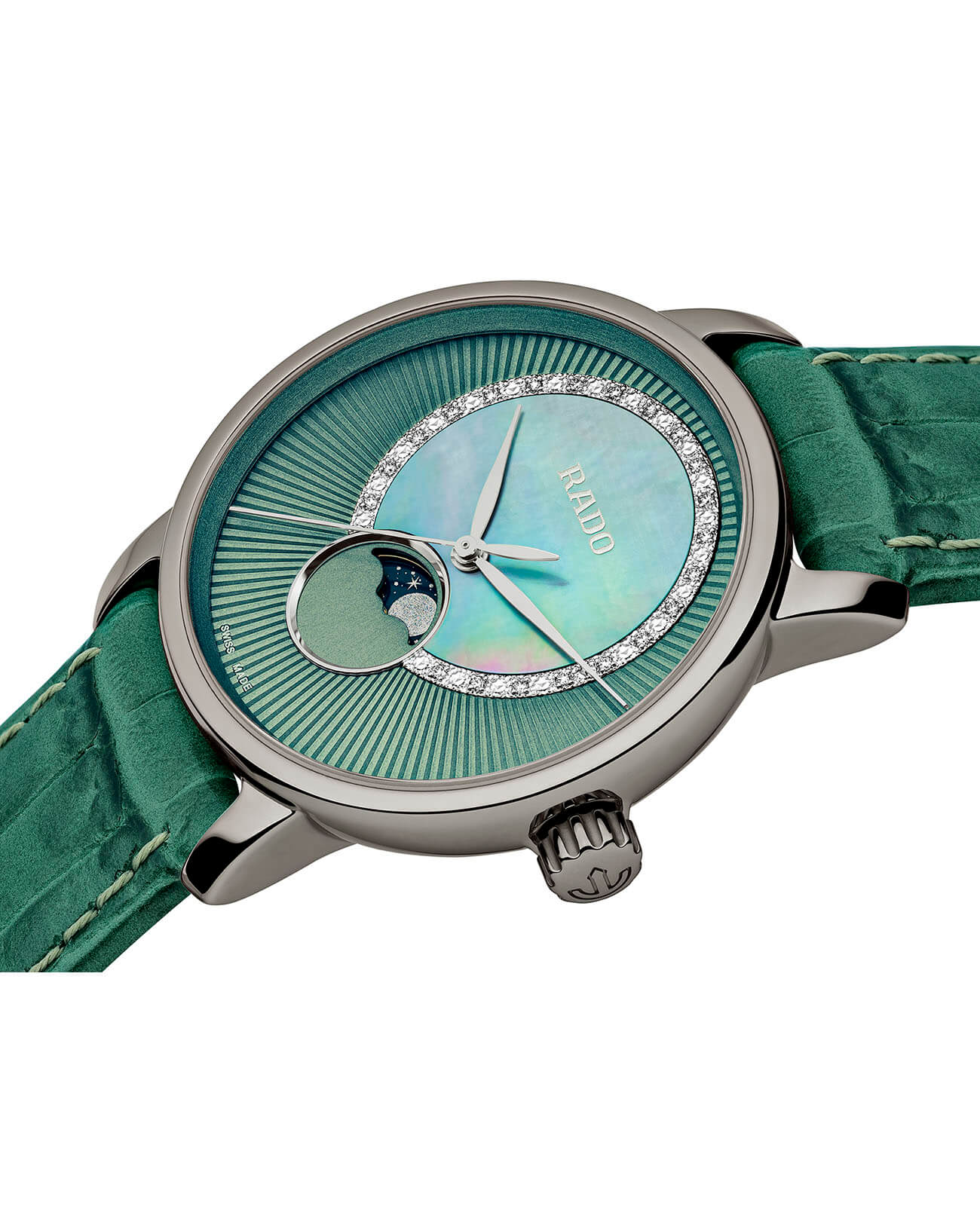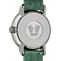 Аксессуар премиальной категории сразу бросается в глаза благодаря насыщенному изумрудному исполнению. Отдельную привлекательность представляет собой узорчатый циферблат с перламутровой вставкой, декорированный 21 бриллиантами в 0,060 карат. Корпус и безель сделаны из плазменной керамикиВысокотехнологичная плазменная керамикаИнновационный материал, технология запатентована. Выплавление керамики осуществляется в печи при 20 000 °C, белоснежный материал под воздействием ультравысокой температуры приобретает уникальный блеск, присущий металлам., что обеспечивает максимально комфортное ношение. Кварцевый механизм ETA F05.841. Сапфировое стекло с антибликовой поверхностью. Задняя крышка с гравировкой. Кожаный ремешок из натурального материала. Миниатюрное окошко отображает фазы луны. Диаметр корпуса: 35 мм.