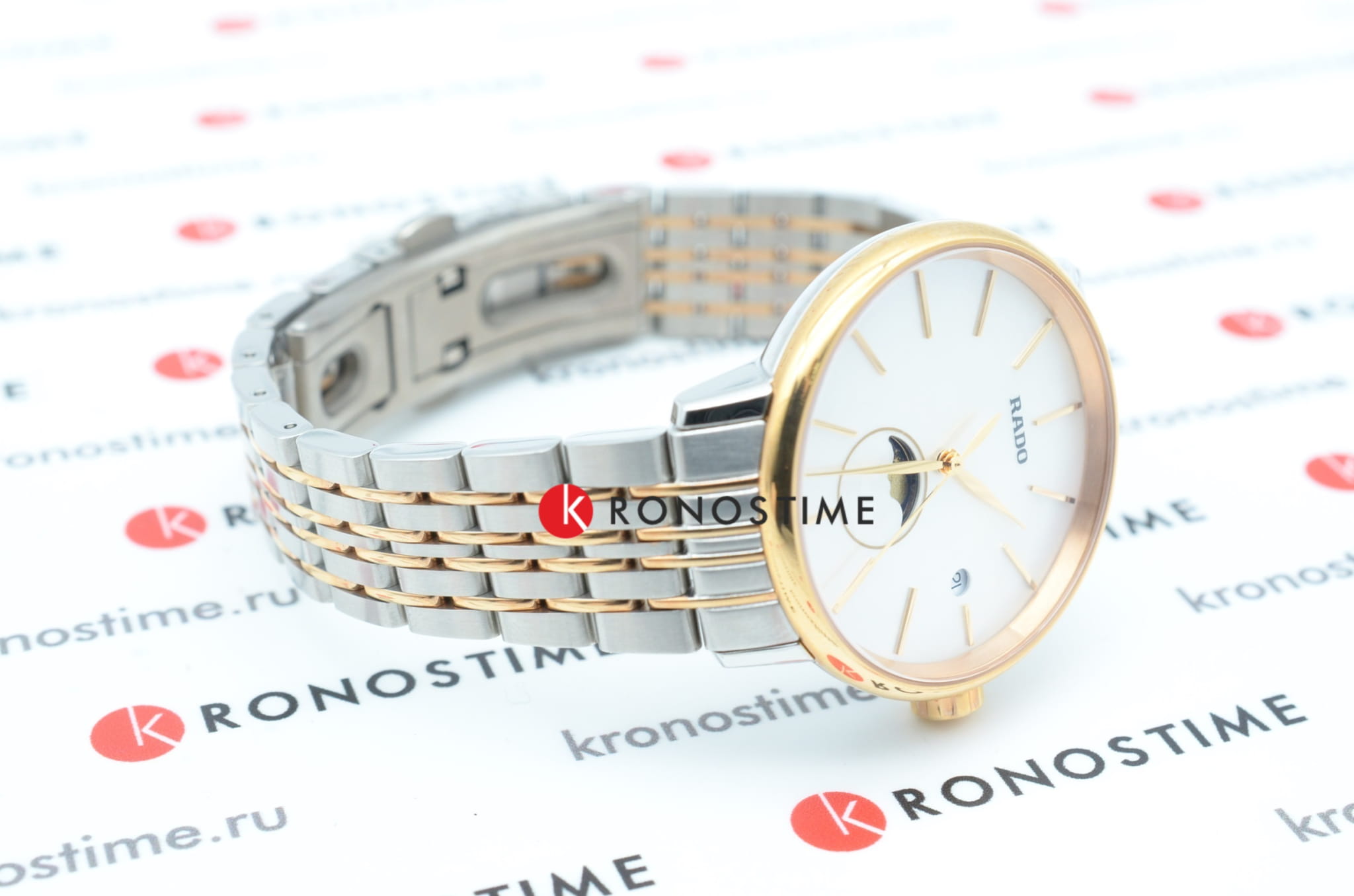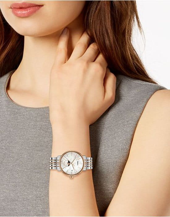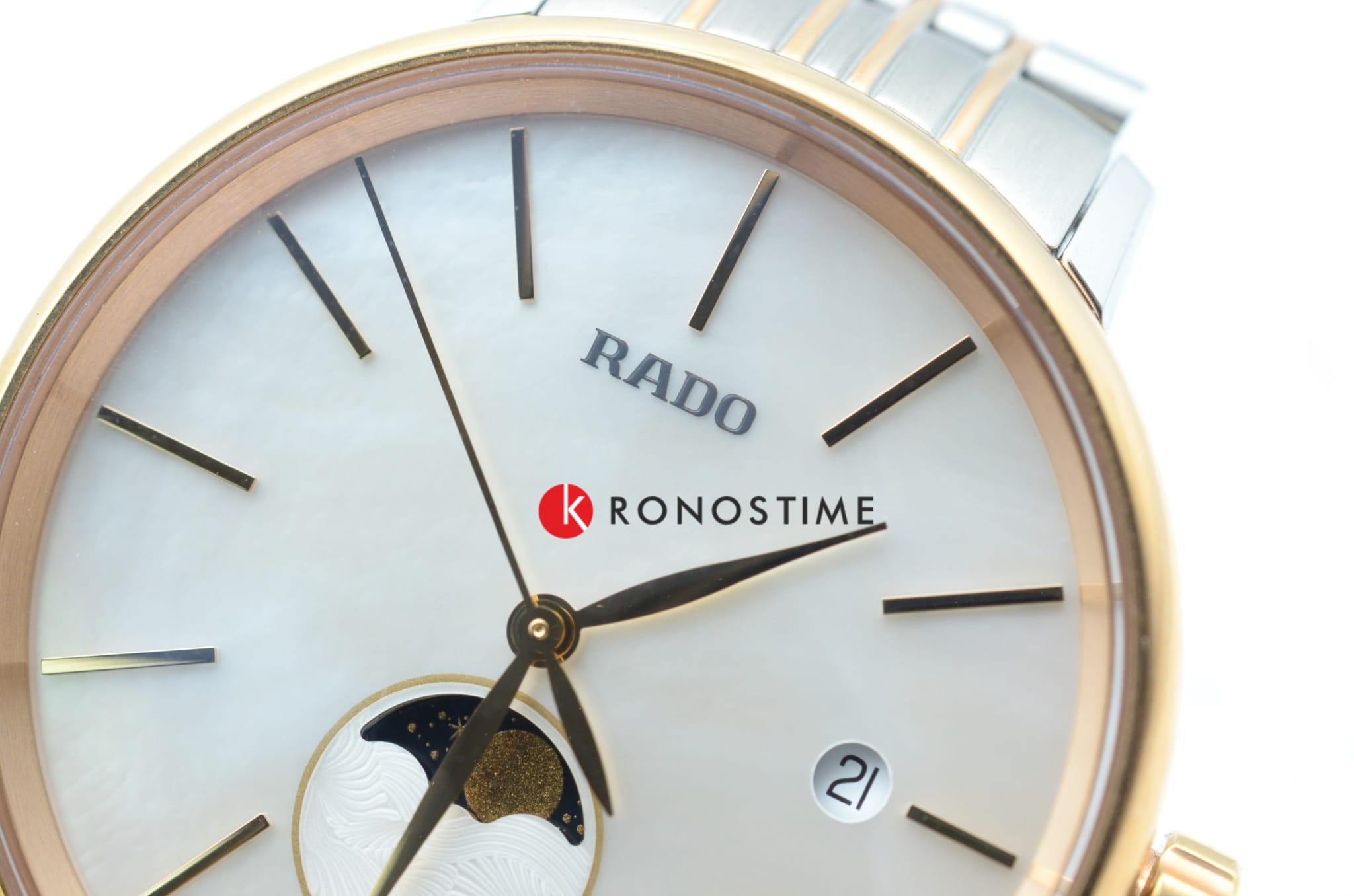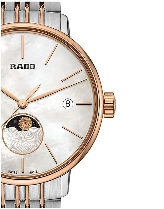 Роскошный перламутровый циферблат завораживает переливающимися оттенками, такое исполнение являет собой настоящую элегантность и особый стиль. Привлекательностью обладает и календарь, отображающий фазы луны. Подобное оформление идеально сочетается с необычным стальным браслетом. Часы работают за счёт высокоточного кварцевого калибра ETA F05.841. Стекло из сапфира имеет антибликовое покрытие. PVD-покрытиеPVDУльтратонкое покрытие наносится в технике вакуумного напыления, сочетает в себе нитрид титана особой прочности со слоем золота или оксида хрома. Несёт в себе декоративную или защитную функцию. корпуса и браслета, оттенок "розовое золото". Апертура даты. Диаметр корпуса: 34 мм.