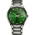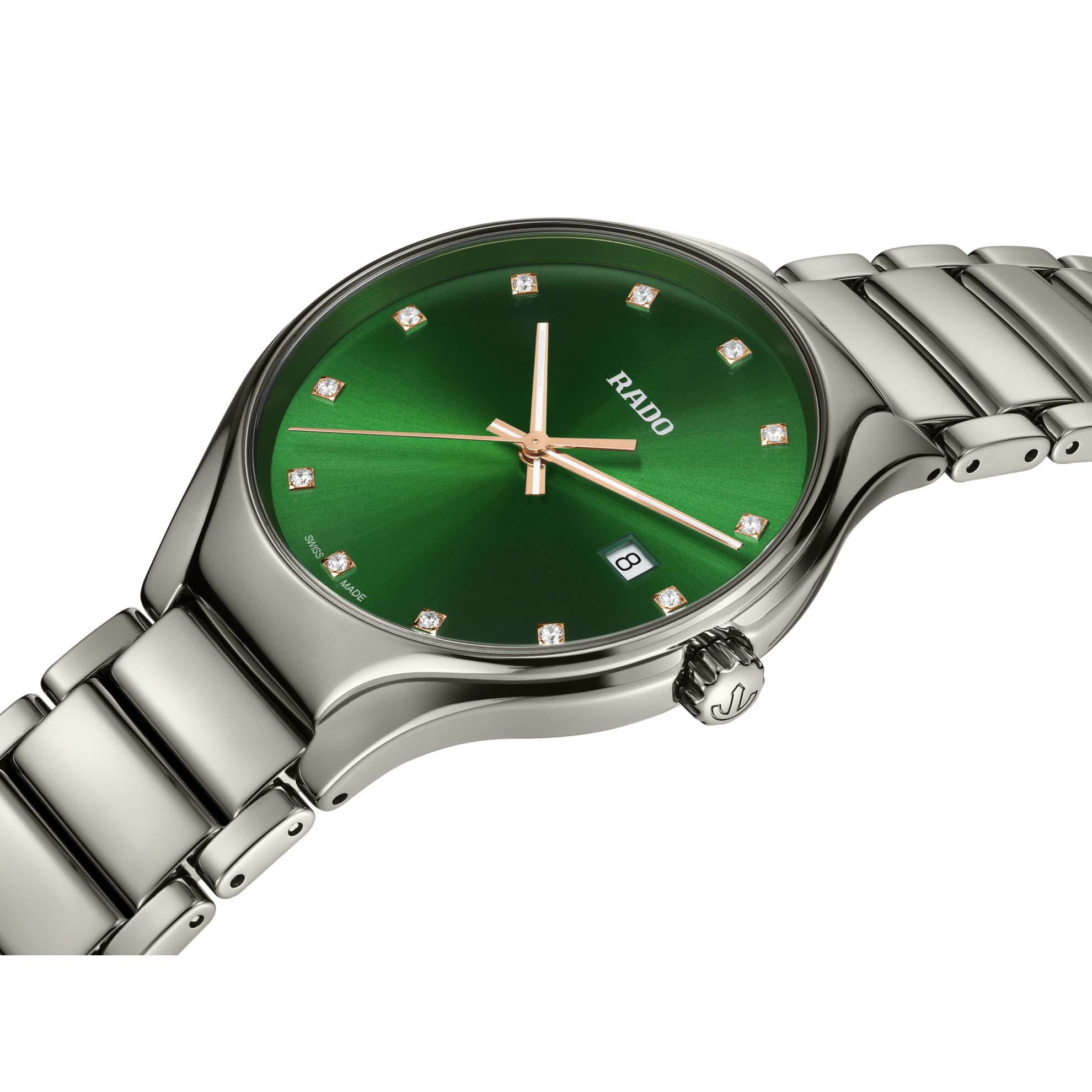 Мужские кварцевые часы Rado True — это изысканный аксессуар с современным дизайном и высокотехнологичными материалами. Корпус диаметром 40 мм выполнен из цельного блока высокотехнологичной плазменной керамикиВысокотехнологичная плазменная керамикаИнновационный материал, технология запатентована. Выплавление керамики осуществляется в печи при 20 000 °C, белоснежный материал под воздействием ультравысокой температуры приобретает уникальный блеск, присущий металлам., что обеспечивает лёгкость, прочность и устойчивость к царапинам. Циферблат зелёного цвета украшен 12 бриллиантами и защищён выпуклым сапфировым стекломСапфировое стеклоПрочный и надёжный материал из кристалла сапфира синтетического происхождения, характеризующийся особой твёрдостью и устойчивостью к царапинам и повреждениям.. Стрелки розового золота с белым покрытием и метки снабжены люминесцентным покрытиемЛюминесцентное покрытиеПозволяет считывать показания времени в темноте. Производители наносят на стрелки, часовые индексы, безель или поверхность циферблата светонакопительный состав, дающий холодное свечение. Super-Luminova®, обеспечивающим отличную читаемость в темноте. Механизм — кварцевый. Часы оснащены браслетом из высокотехнологичной плазменной керамикиВысокотехнологичная плазменная керамикаИнновационный материал, технология запатентована. Выплавление керамики осуществляется в печи при 20 000 °C, белоснежный материал под воздействием ультравысокой температуры приобретает уникальный блеск, присущий металлам. и титана с застёжкой «бабочка» с кнопкамиЗастёжка "бабочка"Такой вид застёжки дополняется предохранителями, помогающими избежать случайного раскрытия браслета. Обладают изящным исполнением. из титана. Водонепроницаемость 50 м позволяет использовать часы в повседневных условиях. Идеальный выбор для тех, кто ценит инновации, стиль и швейцарское качество.