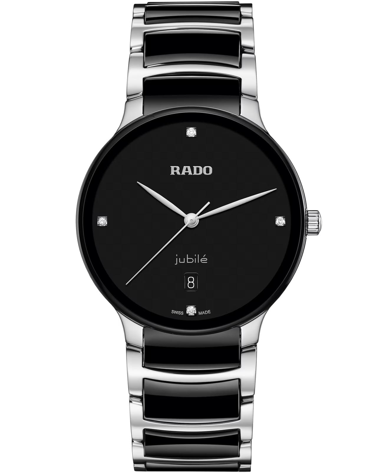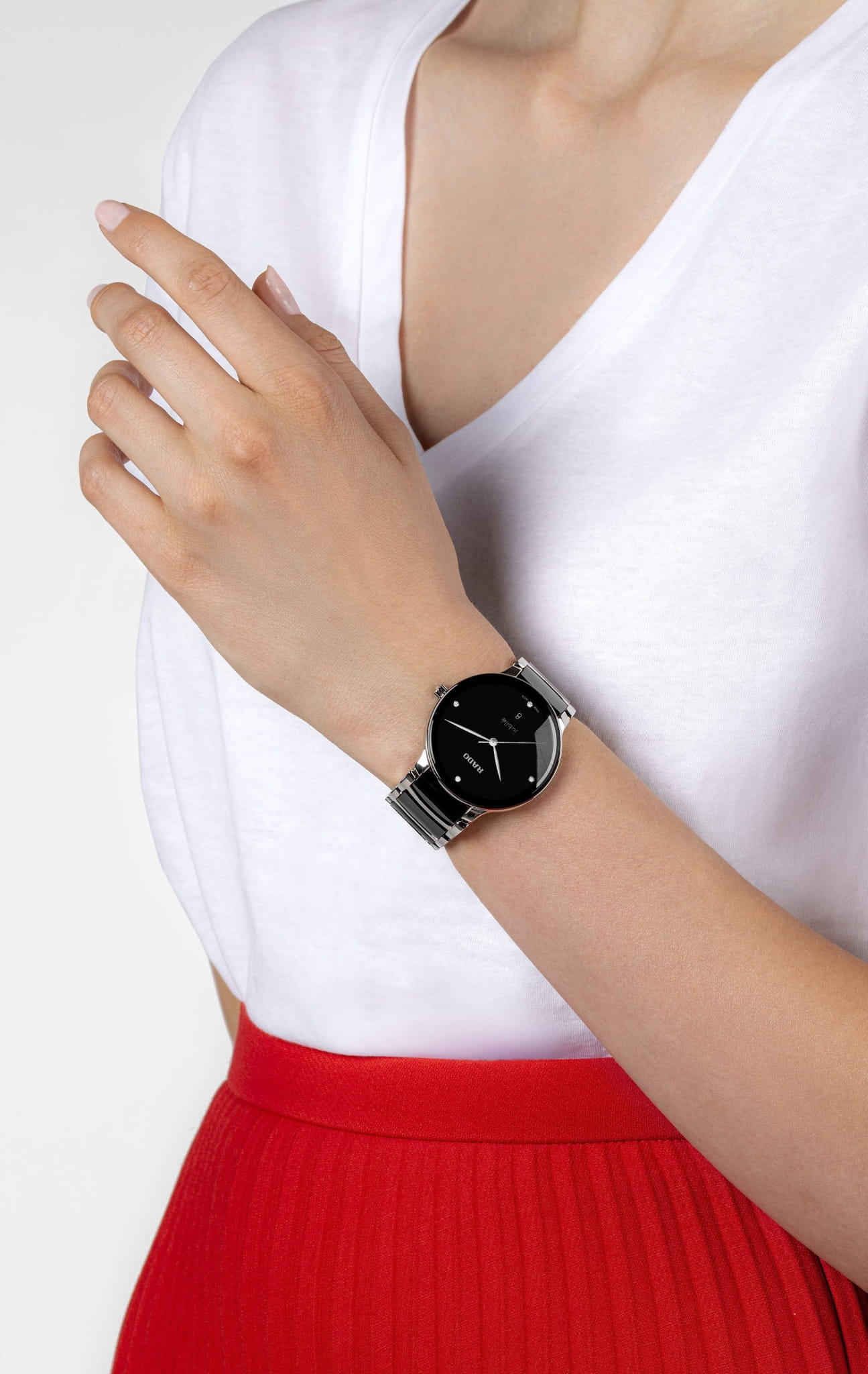 Браслет изготовлен из стали и высокотехнологичной керамикиВысокотехнологичная керамикаИнновационный запатентованный Rado материал с гладкой или матовой поверхностью. Керамика за счёт кристаллической структуры обладает повышенной устойчивостью от возникновения царапин. Материал способен принимать температуру тела человека, обеспечивая невероятный комфорт при ношении., что создаёт эффектное сочетание материалов. Браслет закреплён на удобной и надёжной раскладной застёжкеРаскладная застёжкаТакой тип застёжки используется только на браслетах из металла. Она никогда не раскрывается полностью, происходит разделение на 2 и более частей. Раскладывающая застёжка снизит вероятность потери часов к минимуму., обеспечивая комфортное и безопасное крепление на запястье.