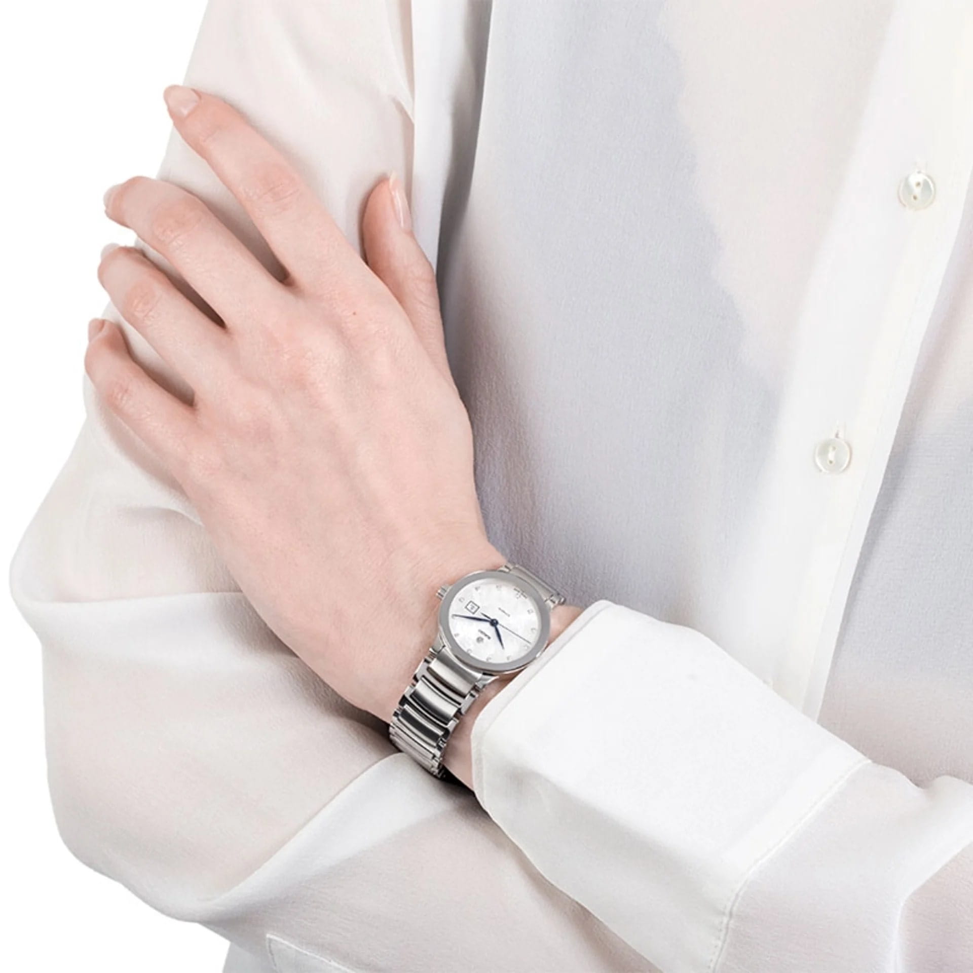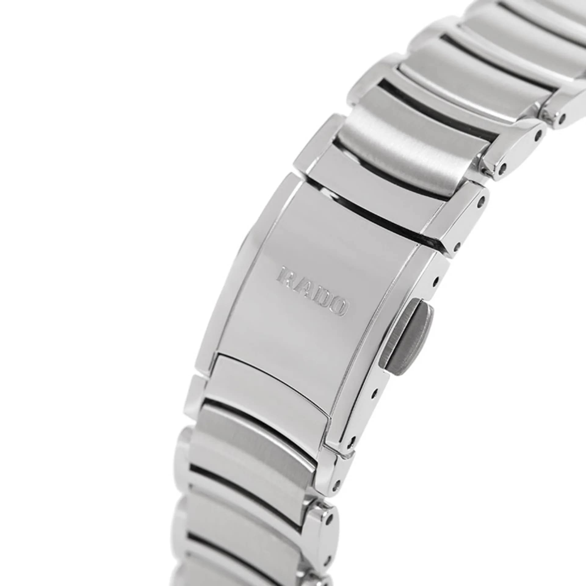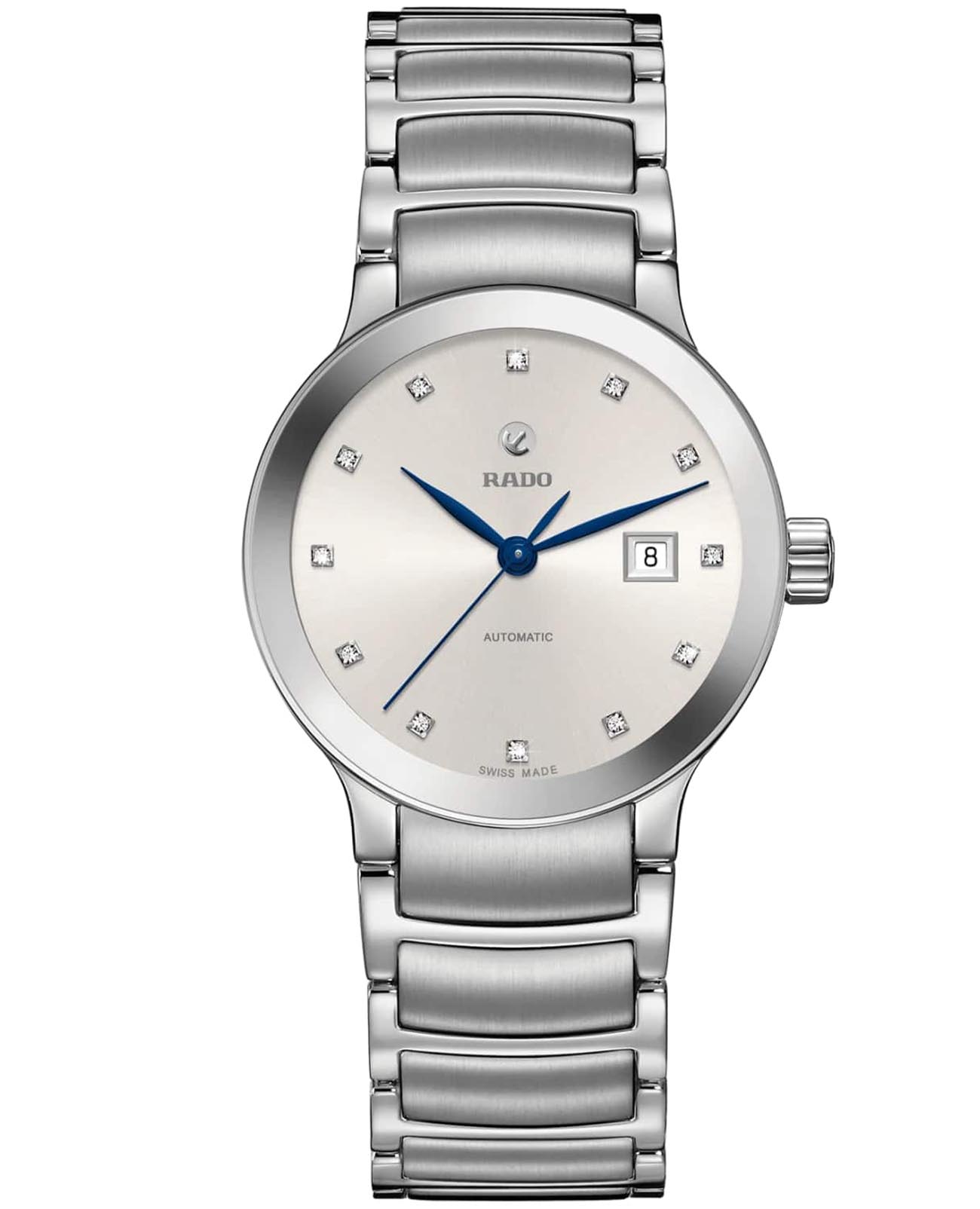 Швейцарские женские механические часы с автоподзаводом Rado Centrix Automatic Diamonds R30027733. Корпус часов изготовлен из стали. Браслет из стали на раскладной застёжкеРаскладная застёжкаТакой тип застёжки используется только на браслетах из металла. Она никогда не раскрывается полностью, происходит разделение на 2 и более частей. Раскладывающая застёжка снизит вероятность потери часов к минимуму.. Сапфировое стеклоСапфировое стеклоПрочный и надёжный материал из кристалла сапфира синтетического происхождения, характеризующийся особой твёрдостью и устойчивостью к царапинам и повреждениям. устойчивое к мелким механическим повреждениям. Класс водозащиты: 30 метров, позволит защитить корпус от случайных брызг или капель дождя. Окошко даты находится в положении 3 часа. Циферблат инкрустирован бриллиантами.