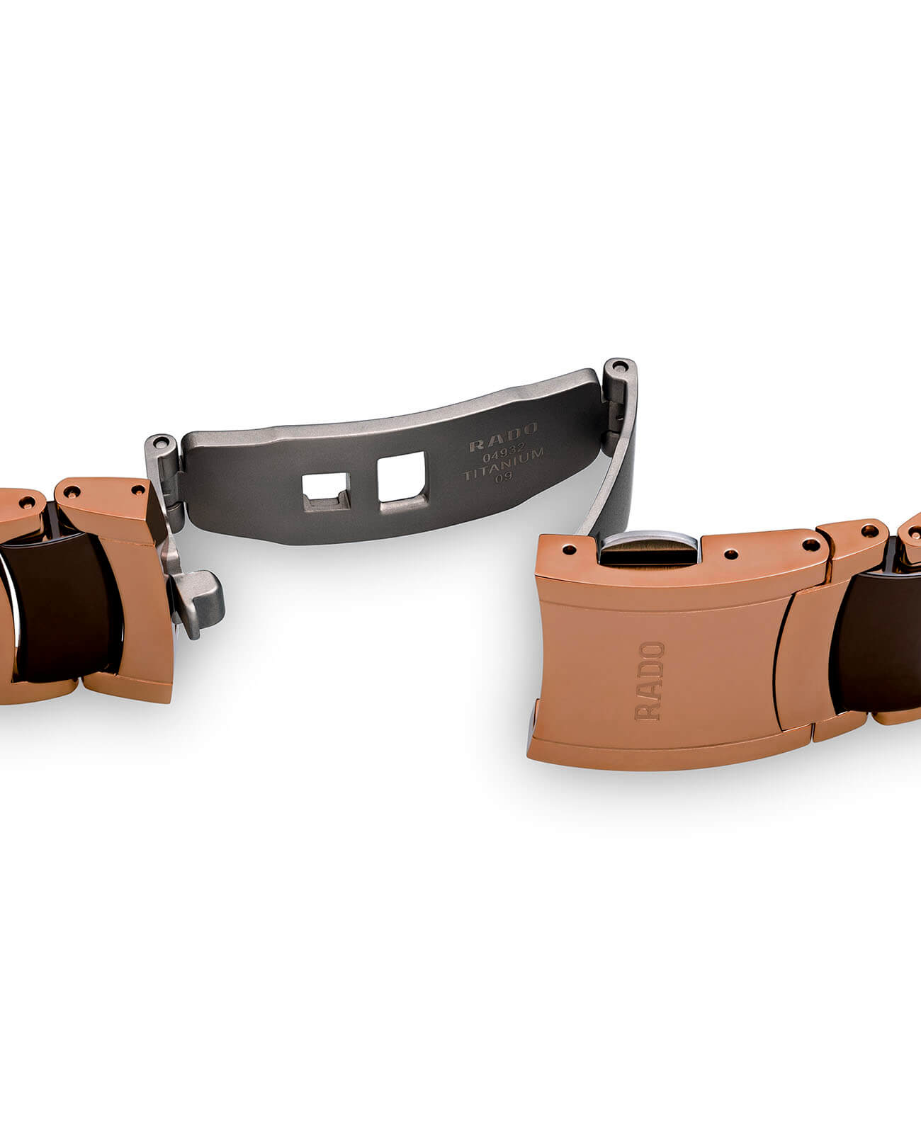 Люксовая модель позволит чувствовать себя уверенно при любых обстоятельствах. Минималистичный циферблат стильно смотрится в сочетании с PVD-покрытиемPVDУльтратонкое покрытие наносится в технике вакуумного напыления, сочетает в себе нитрид титана особой прочности со слоем золота или оксида хрома. Несёт в себе декоративную или защитную функцию. цвета розового золота для стального корпуса и браслета. Автоматическая система завода. Швейцарский механизм ETA 2671 с запасом хода до 38 часов. Браслет со вставками высокотехнологичной керамикиВысокотехнологичная керамикаИнновационный запатентованный Rado материал с гладкой или матовой поверхностью. Керамика за счёт кристаллической структуры обладает повышенной устойчивостью от возникновения царапин. Материал способен принимать температуру тела человека, обеспечивая невероятный комфорт при ношении.. Сапфировое стекло. Водонепроницаемость 30 метров. . Окошко индикации числа. Диаметр корпуса: 28 мм.