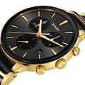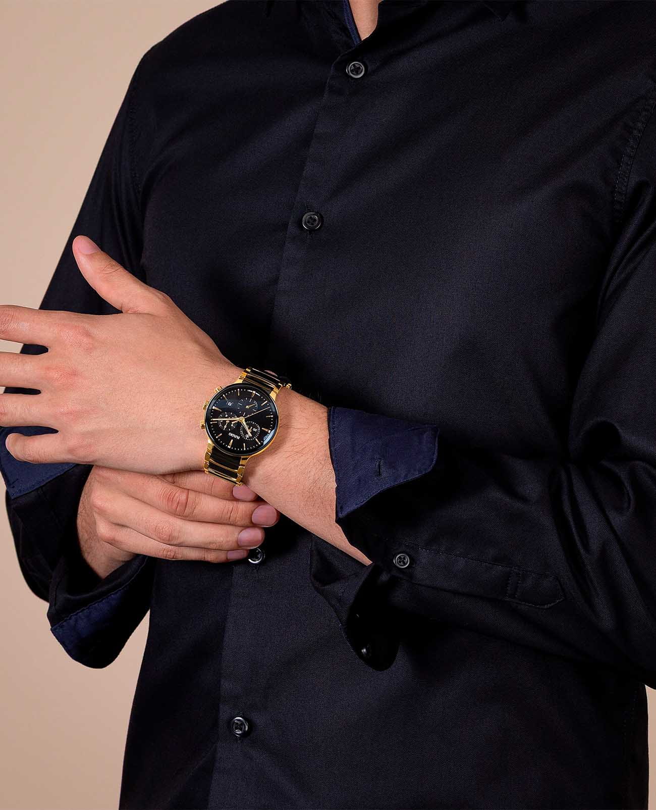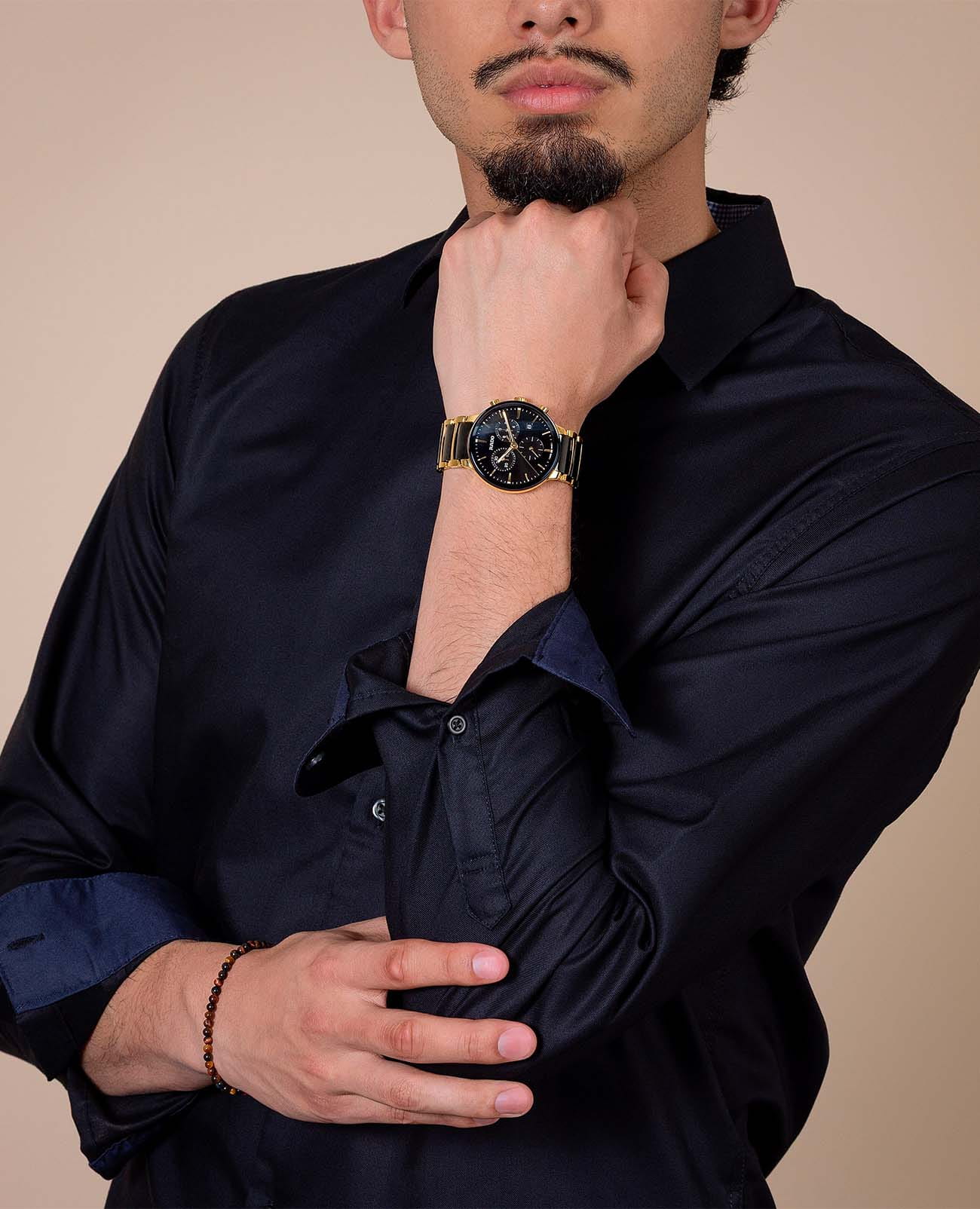 Мужские кварцевые часы Rado Centrix Chronograph — это гармоничное сочетание художественного выражения и изысканного дизайна. Корпус диаметром 41 мм и толщиной 11,4 мм выполнен из нержавеющей стали с PVD-покрытиемPVDУльтратонкое покрытие наносится в технике вакуумного напыления, сочетает в себе нитрид титана особой прочности со слоем золота или оксида хрома. Несёт в себе декоративную или защитную функцию.. Циферблат чёрного цвета с эффектом «солнечные лучи» оформлен накладными индексами цвета родия с люминесцентным покрытиемЛюминесцентное покрытиеПозволяет считывать показания времени в темноте. Производители наносят на стрелки, часовые индексы, безель или поверхность циферблата светонакопительный состав, дающий холодное свечение. Super-Luminova®, обеспечивающим отличную читаемость в темноте. Циферблат защищён выпуклым сапфировым стекломСапфировое стеклоПрочный и надёжный материал из кристалла сапфира синтетического происхождения, характеризующийся особой твёрдостью и устойчивостью к царапинам и повреждениям. с антибликовым покрытиемАнтибликовое покрытиеСлой оксида металла в 0,13-0,3 микрон, благодаря которому стекло часов не бликует и не отражает свет. Антибликовое покрытие уменьшает отражение света в 10 раз, обеспечивая отличную читаемость показателей циферблата. с обеих сторон. Механизм — швейцарский кварцевый с функцией хронографаХронографФункция позволяет измерять отрезки времени с особой точностью: часы, минуты, секунды. Верным признаком хронографа является наличие на циферблате 3 дополнительных окошек-счётчиков., оснащённый 22 камнями и технологиями Precidrive и Heavydrive, обеспечивающими точность хода ±10 секунд в год. Циферблат включает три субциферблата: 30-минутный счётчик, индикатор одной десятой секунды и малые секунды в положении 6 часов. Окошко даты расположено в положении 4 часов. Часы оснащены браслетом из полированной нержавеющей стали с с PVD-покрытиемPVDУльтратонкое покрытие наносится в технике вакуумного напыления, сочетает в себе нитрид титана особой прочности со слоем золота или оксида хрома. Несёт в себе декоративную или защитную функцию. и со вставками из высокотехнологичной керамикиВысокотехнологичная керамикаИнновационный запатентованный Rado материал с гладкой или матовой поверхностью. Керамика за счёт кристаллической структуры обладает повышенной устойчивостью от возникновения царапин. Материал способен принимать температуру тела человека, обеспечивая невероятный комфорт при ношении. чёрного цвета и застёжкой «бабочка» с кнопкамиЗастёжка "бабочка"Такой вид застёжки дополняется предохранителями, помогающими избежать случайного раскрытия браслета. Обладают изящным исполнением. из матовой стали. Водонепроницаемость 50 м позволяет использовать часы в повседневных условиях. Гарантия — 5 лет. Идеальный выбор для тех, кто ценит точность, стиль и швейцарское качество.